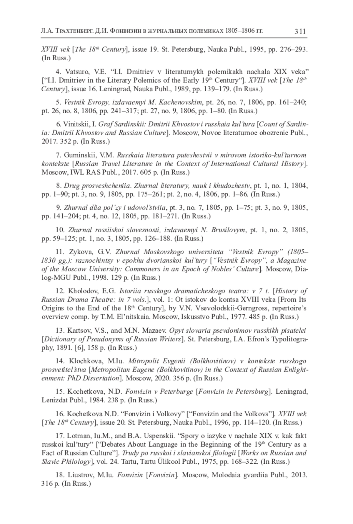 6. Виницкий И. Граф Сардинский: Дмитрий Хвостов и русская культура. М.: НЛО, 2017. 352 с.
