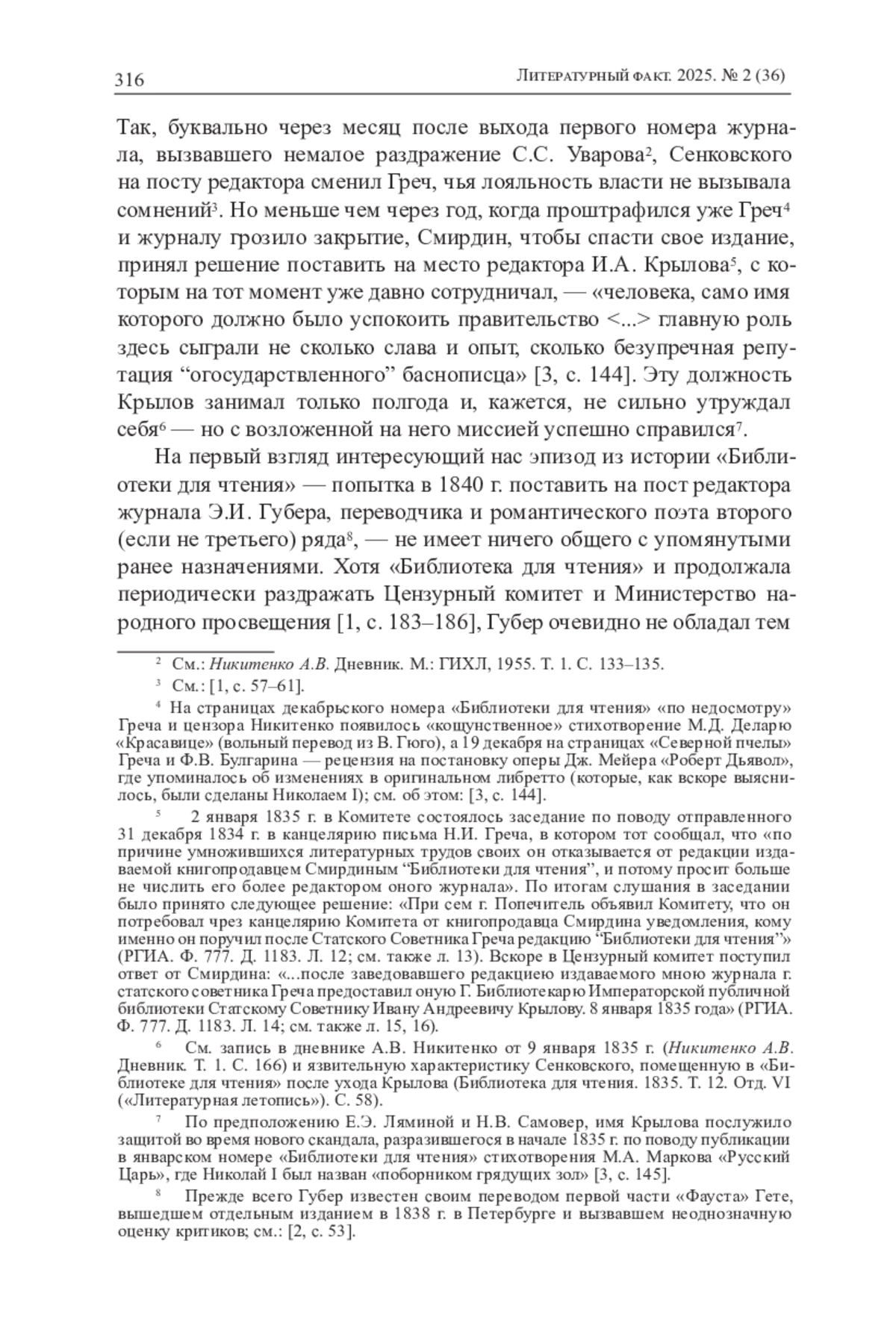 Хотя журнал «Библиотека для чтения» прочно ассоциируется с именем О. И. Сенковского, известно, что в разное время в качестве его редакторов выступали и другие лица: Н. И. Греч, И. А. Крылов, Е. Ф. Корш. По всей видимости, эту должность они занимали формально, и в первые годы существования журнала их задача заключалась скорее в том, чтобы выступать гарантом благонадежности перед правительством. Кроме того, в какой-то момент имя редактора становилось своего рода «брендом» - и именно в такой «бренд» превратилось имя Сенковского в середине 1830-х гг. В этом контексте представляет особый интерес попытка Сенковского поставить весной 1840 г. на должность ответственного редактора «Библиотеки для чтения» Э. И. Губера - человека на литературной арене малозаметного. Вероятно, Сенковский действительно хотел по крайней мере разделить часть редакторских обязанностей с новым сотрудником, но это противоречило коммерческим интересам совладельца издания А. Ф. Смирдина. В присланном для Цензурного комитета уведомлении он не возражал против этого назначения, но лишь при соблюдении двух условий, одно из которых (запретить периодическим изданиям публиковать сообщения о новом редакторе «Библиотеки для чтения») оставило членов комитета в некотором недоумении, но прийти к компромиссу издателю и цензурному комитету не удалось.