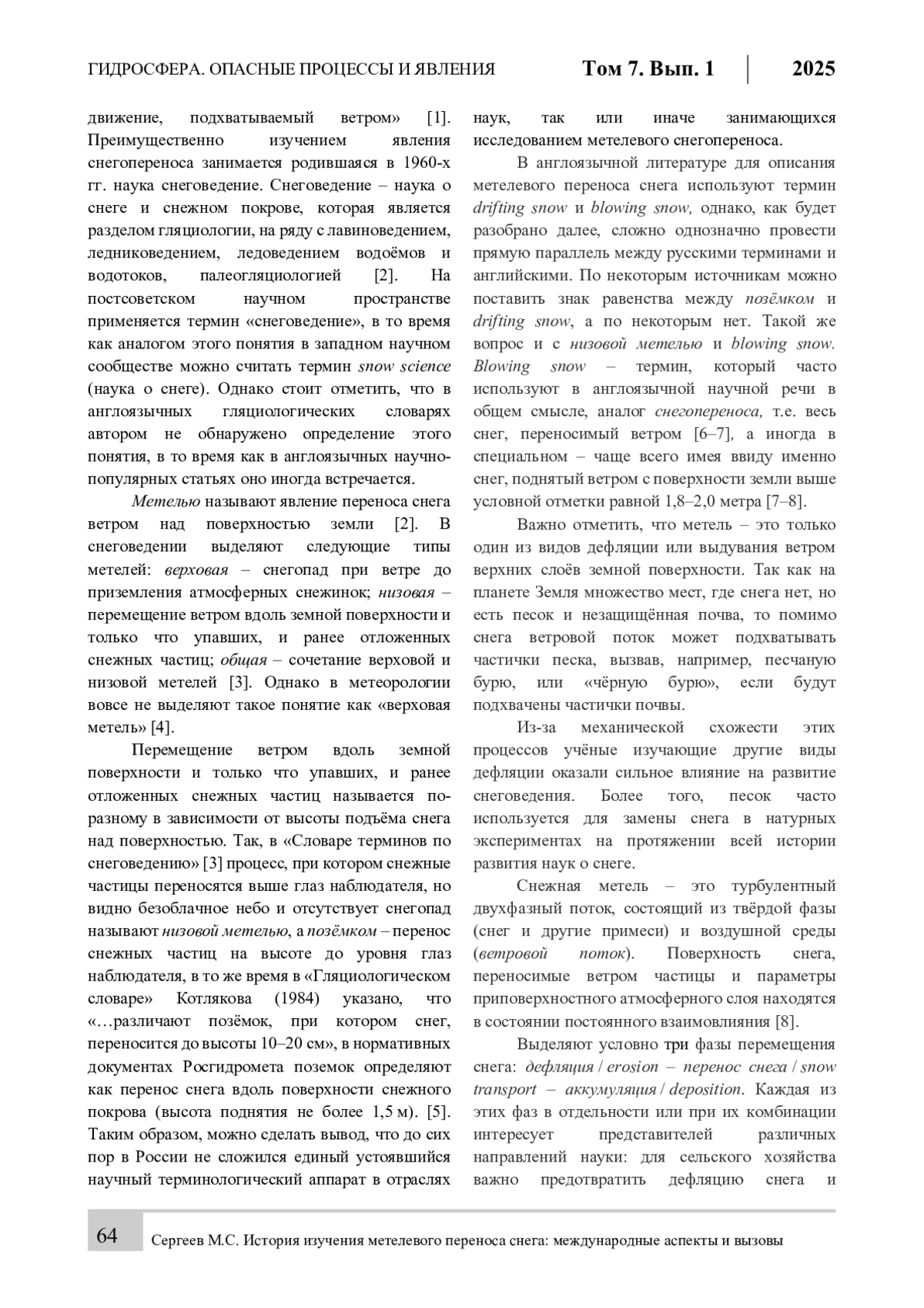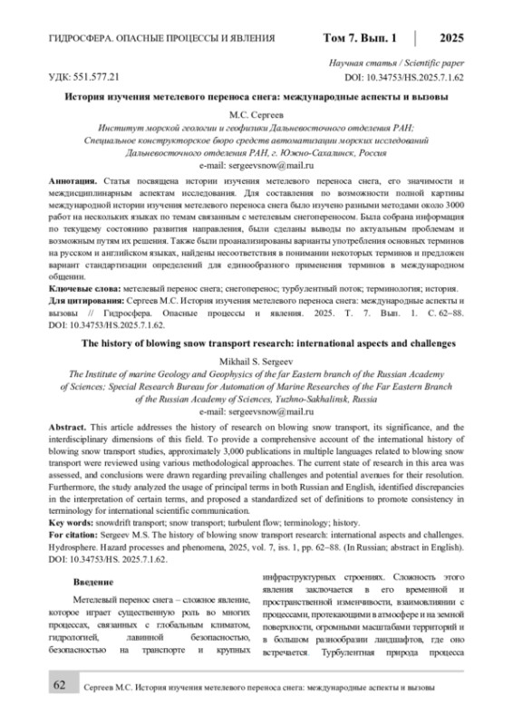 Статья посвящена истории изучения метелевого переноса снега, его значимости и междисциплинарным аспектам исследования. Для составления по возможности полной картины международной истории изучения метелевого переноса снега было изучено разными методами около 3000 работ на нескольких языках по темам связанным с метелевым снегопереносом. Была собрана информация по текущему состоянию развития направления, были сделаны выводы по актуальным проблемам и возможным путям их решения. Также были проанализированы варианты употребления основных терминов на русском и английском языках, найдены несоответствия в понимании некоторых терминов и предложен вариант стандартизации определений для единообразного применения терминов в международном общении.