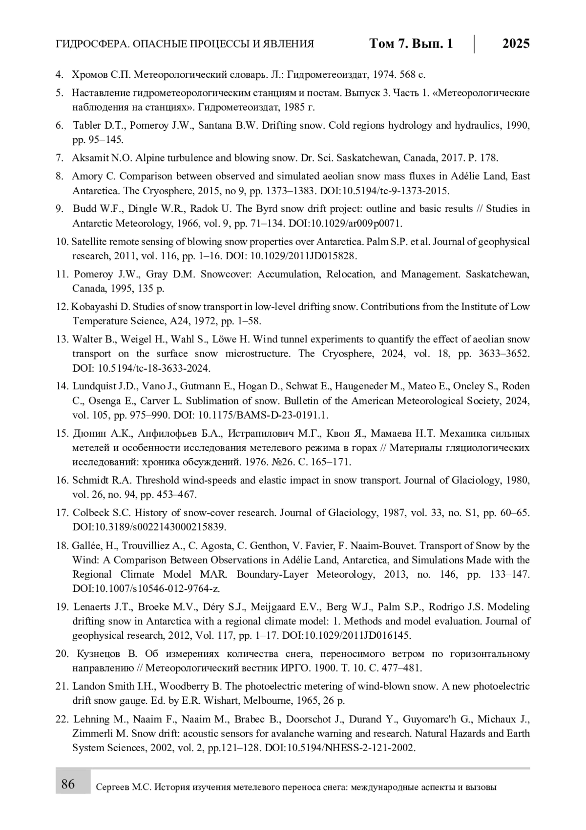 15. Дюнин А.К., Анфилофьев Б.А., Истрапилович М.Г., Квон Я., Мамаева Н.Т. Механика сильных метелей и особенности исследования метелевого режима в горах // Материалы гляциологических исследований: хроника обсуждений. 1976. №26. С. 165-171.