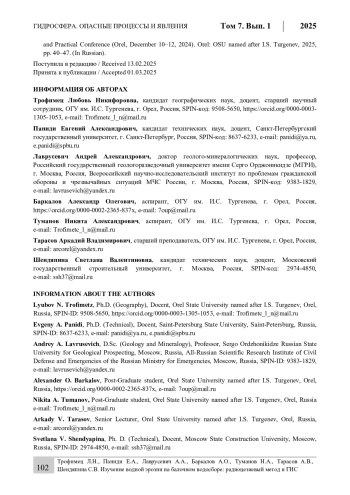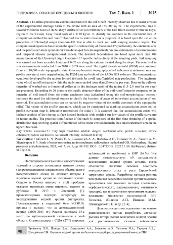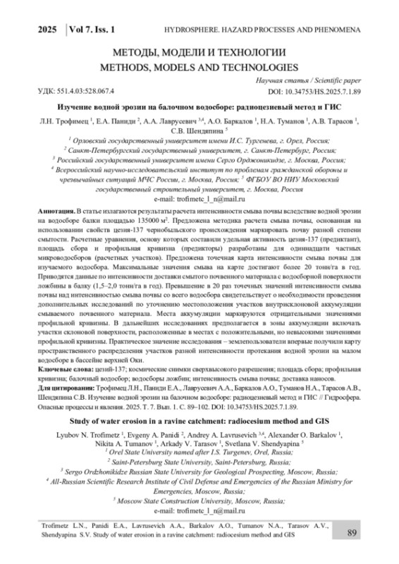 Trofimets L.N., Fadeeva A.A. Calculation of the delivery of washed-away soil from the plowed basin of the hollow using ultra-high-resolution satellite images, topographic surveys and the radiocesium method (Sukhoi Orlica basin). Natural resources: state and rational use: proceedings of the International Scientific and Practical Conference (Orel, December 10-12, 2024). Orel: OSU named after I.S. Turgenev, 2025, pp. 40-47. (In Russian).