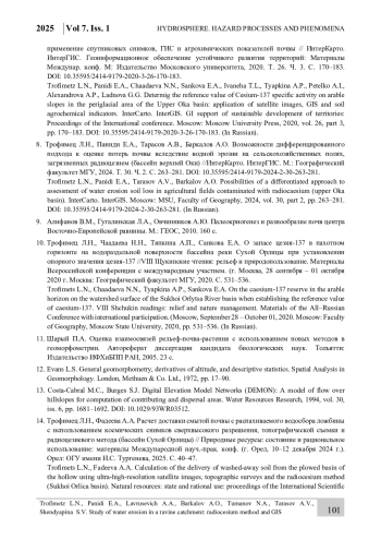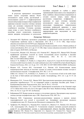 14. Трофимец Л.Н., Фадеева А.А. Расчет доставки смытой почвы с распахиваемого водосбора ложбины с использованием космических снимков сверхвысокого разрешения, топографической съемки и радиоцезиевого метода (бассейн Сухой Орлицы) // Природные ресурсы: состояние и рациональное использование: материалы Международной науч.-прак. конф. (г. Орел, 10-12 декабря 2024 г.). Орел: ОГУ имени И.С. Тургенева, 2025. С. 40-47.