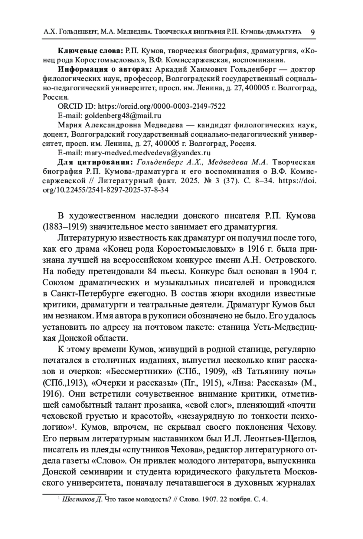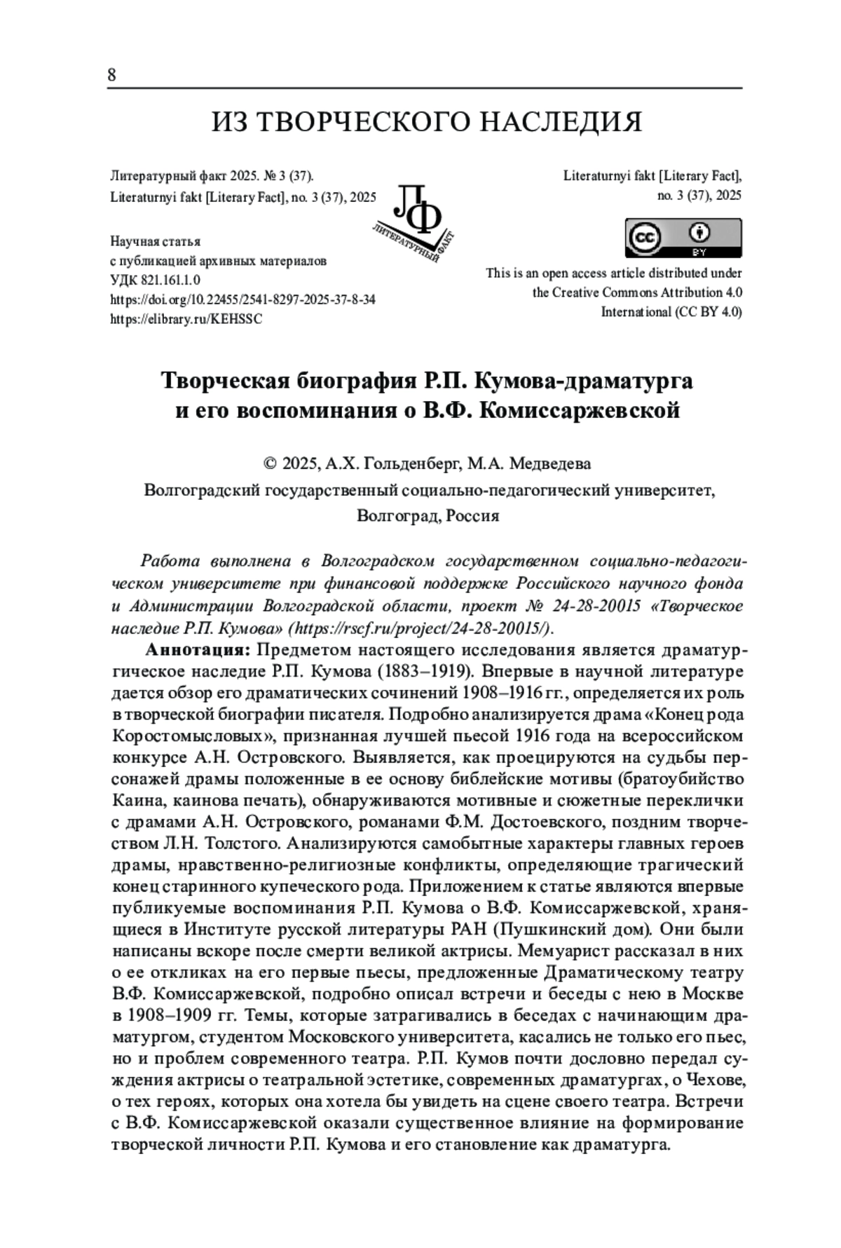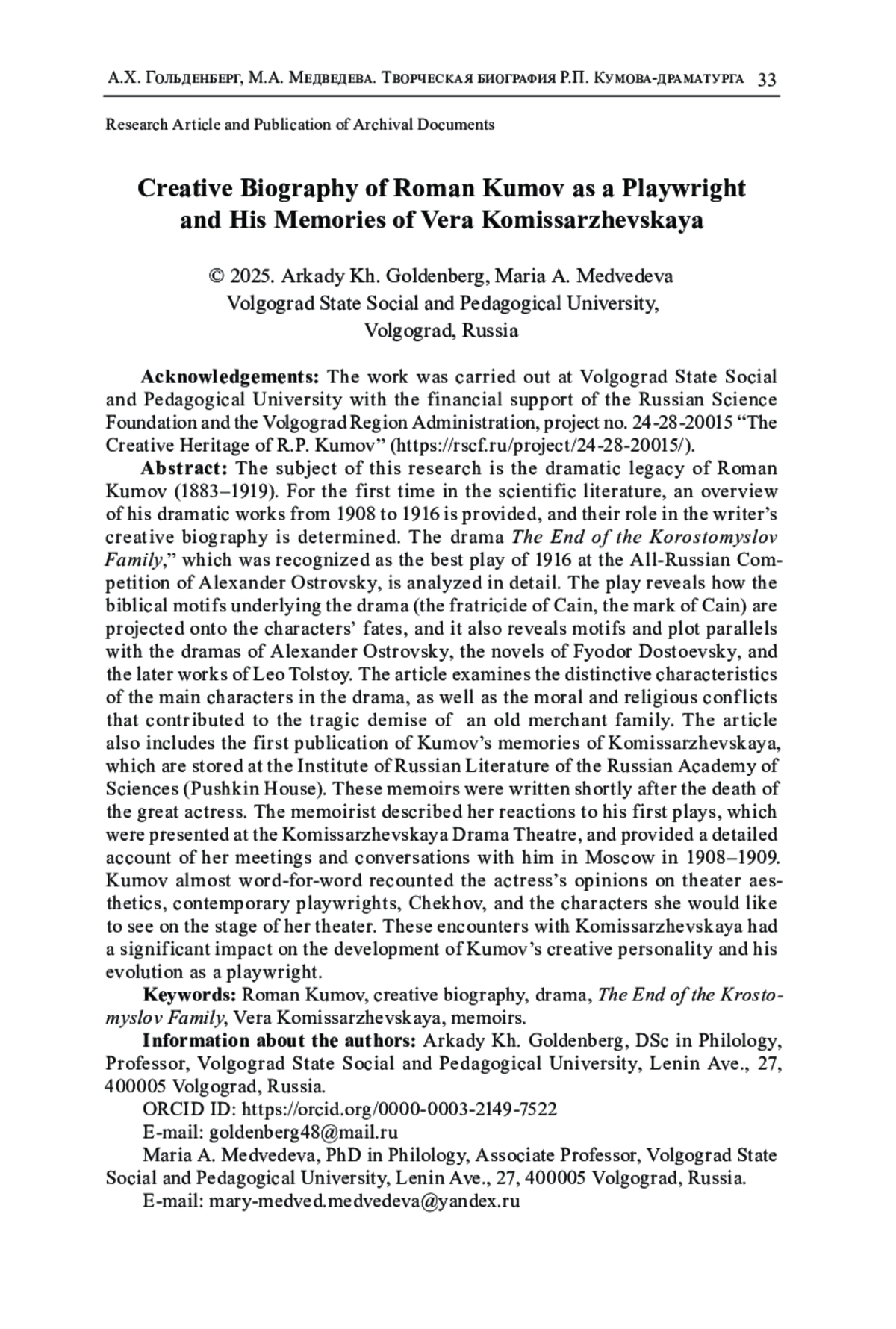 Предметом настоящего исследования является драматургическое наследие Р. П. Кумова (1883-1919). Впервые в научной литературе дается обзор его драматических сочинений 1908-1916 гг., определяется их роль в творческой биографии писателя. Подробно анализируется драма «Конец рода Коростомысловых», признанная лучшей пьесой 1916 года на всероссийском конкурсе А. Н. Островского. Выявляется, как проецируются на судьбы персонажей драмы положенные в ее основу библейские мотивы (братоубийство Каина, каинова печать), обнаруживаются мотивные и сюжетные переклички с драмами А. Н. Островского, романами Ф. М. Достоевского, поздним творчеством Л. Н. Толстого. Анализируются самобытные характеры главных героев драмы, нравственно-религиозные конфликты, определяющие трагический конец старинного купеческого рода. Приложением к статье являются впервые публикуемые воспоминания Р. П. Кумова о В. Ф. Комиссаржевской, хранящиеся в Институте русской литературы РАН (Пушкинский дом). Они были написаны вскоре после смерти великой актрисы. Мемуарист рассказал в них о ее откликах на его первые пьесы, предложенные Драматическому театру В. Ф. Комиссаржевской, подробно описал встречи и беседы с нею в Москве в 1908-1909 гг. Темы, которые затрагивались в беседах с начинающим драматургом, студентом Московского университета, касались не только его пьес, но и проблем современного театра. Р. П. Кумов почти дословно передал суждения актрисы о театральной эстетике, современных драматургах, о Чехове, о тех героях, которых она хотела бы увидеть на сцене своего театра. Встречи с В. Ф. Комиссаржевской оказали существенное влияние на формирование творческой личности Р. П. Кумова и его становление как драматурга.