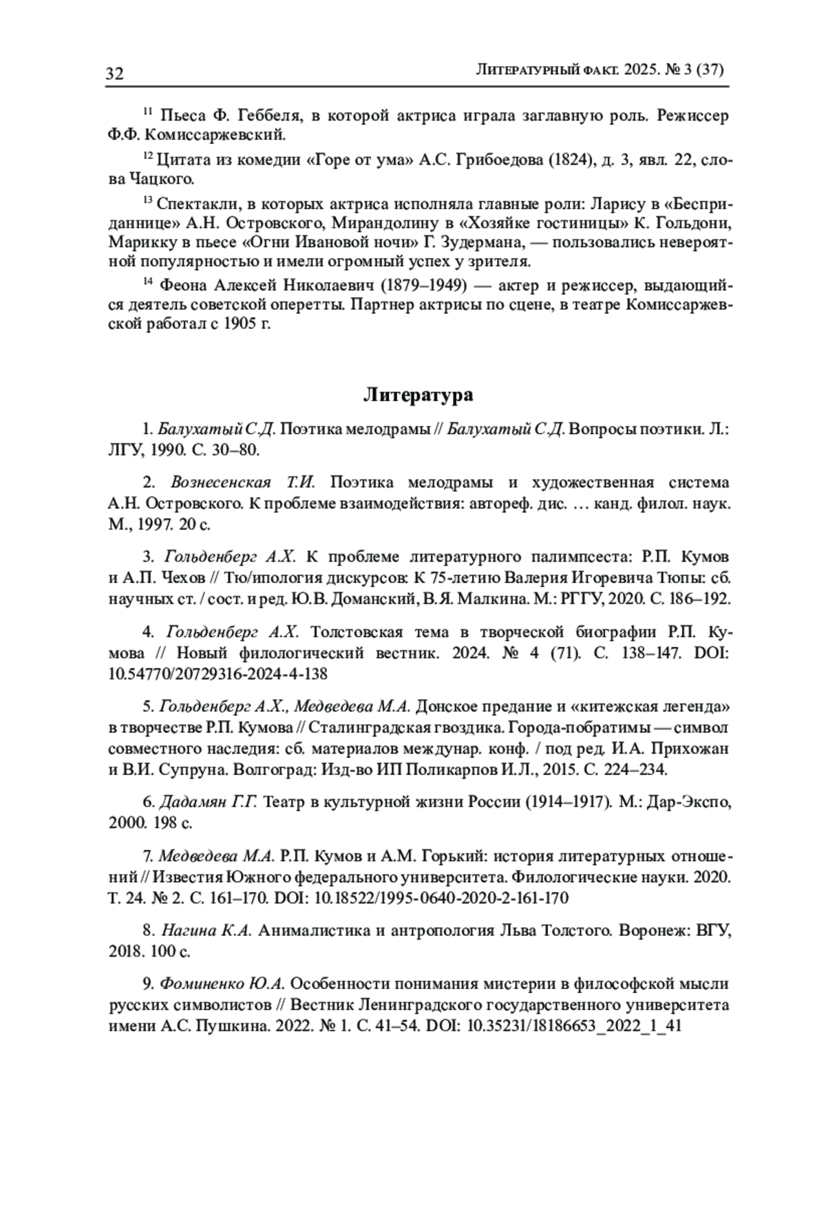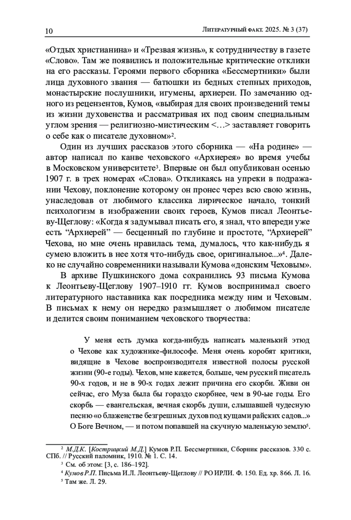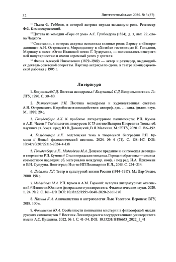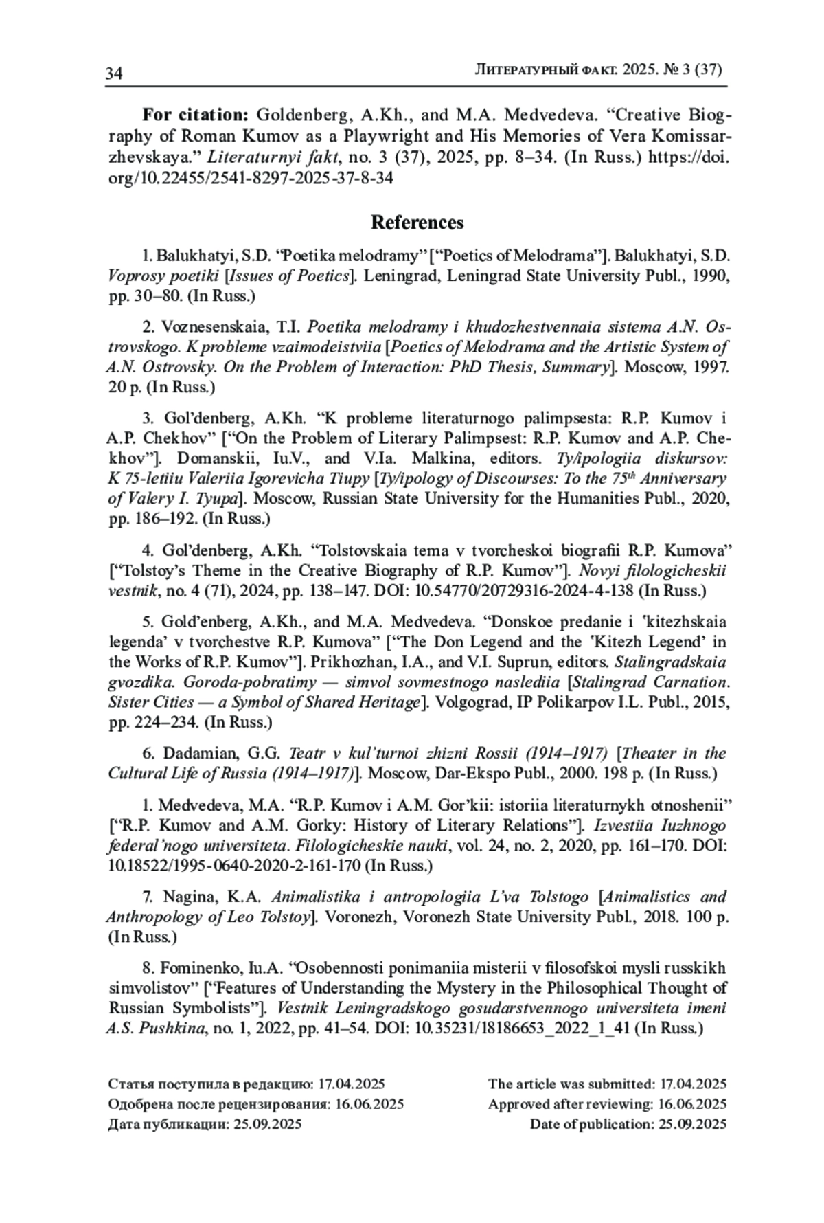 Предметом настоящего исследования является драматургическое наследие Р. П. Кумова (1883-1919). Впервые в научной литературе дается обзор его драматических сочинений 1908-1916 гг., определяется их роль в творческой биографии писателя. Подробно анализируется драма «Конец рода Коростомысловых», признанная лучшей пьесой 1916 года на всероссийском конкурсе А. Н. Островского. Выявляется, как проецируются на судьбы персонажей драмы положенные в ее основу библейские мотивы (братоубийство Каина, каинова печать), обнаруживаются мотивные и сюжетные переклички с драмами А. Н. Островского, романами Ф. М. Достоевского, поздним творчеством Л. Н. Толстого. Анализируются самобытные характеры главных героев драмы, нравственно-религиозные конфликты, определяющие трагический конец старинного купеческого рода. Приложением к статье являются впервые публикуемые воспоминания Р. П. Кумова о В. Ф. Комиссаржевской, хранящиеся в Институте русской литературы РАН (Пушкинский дом). Они были написаны вскоре после смерти великой актрисы. Мемуарист рассказал в них о ее откликах на его первые пьесы, предложенные Драматическому театру В. Ф. Комиссаржевской, подробно описал встречи и беседы с нею в Москве в 1908-1909 гг. Темы, которые затрагивались в беседах с начинающим драматургом, студентом Московского университета, касались не только его пьес, но и проблем современного театра. Р. П. Кумов почти дословно передал суждения актрисы о театральной эстетике, современных драматургах, о Чехове, о тех героях, которых она хотела бы увидеть на сцене своего театра. Встречи с В. Ф. Комиссаржевской оказали существенное влияние на формирование творческой личности Р. П. Кумова и его становление как драматурга.
