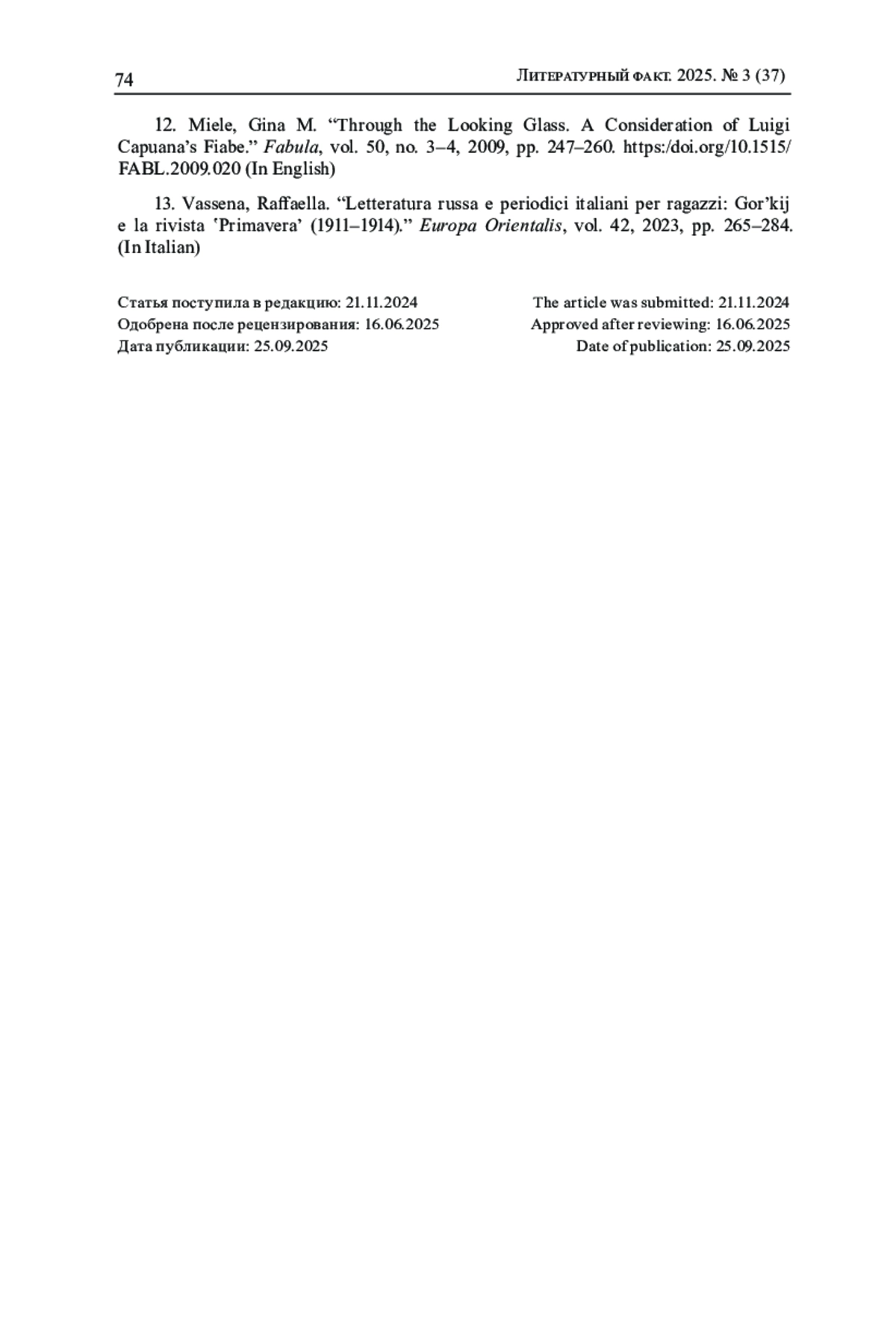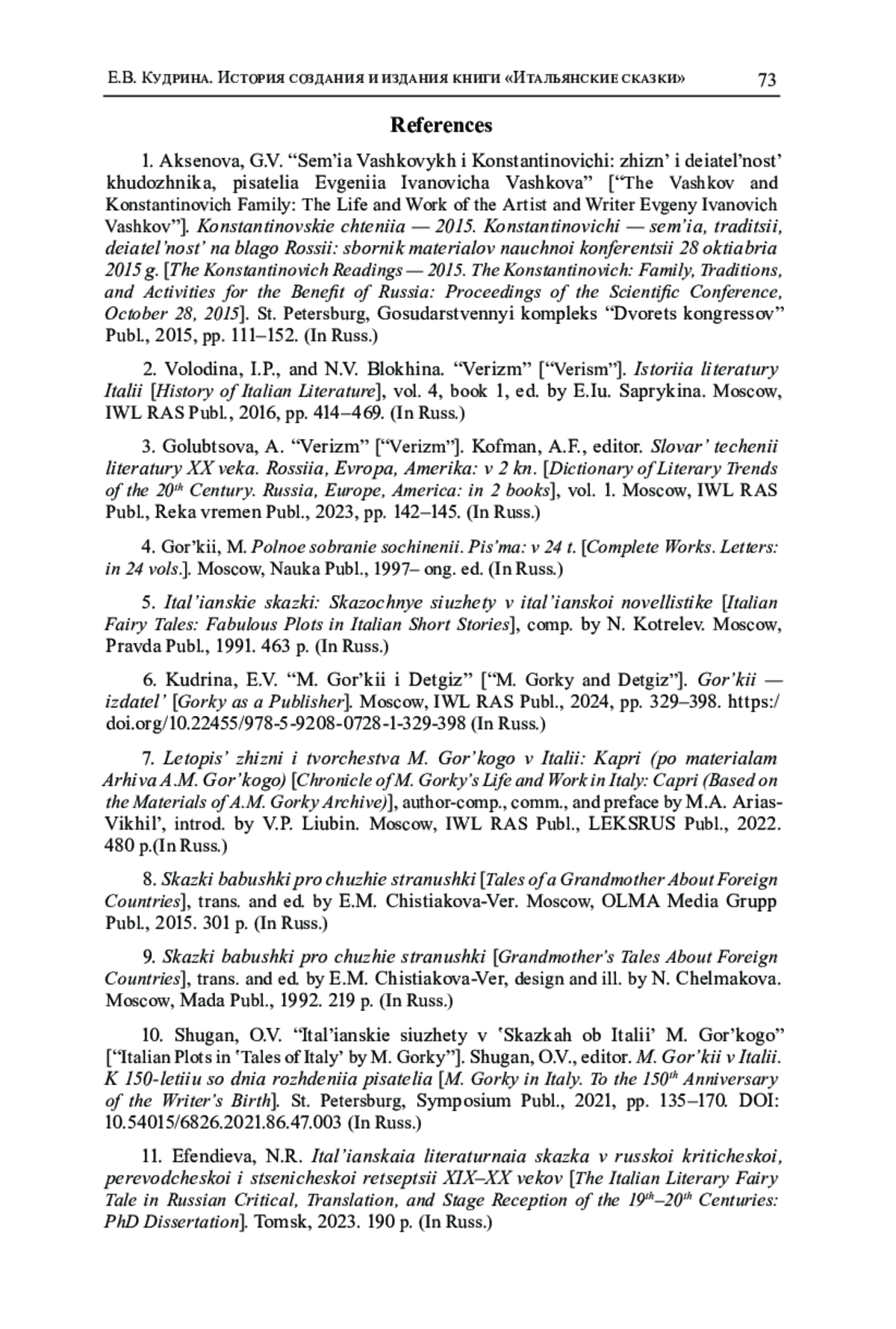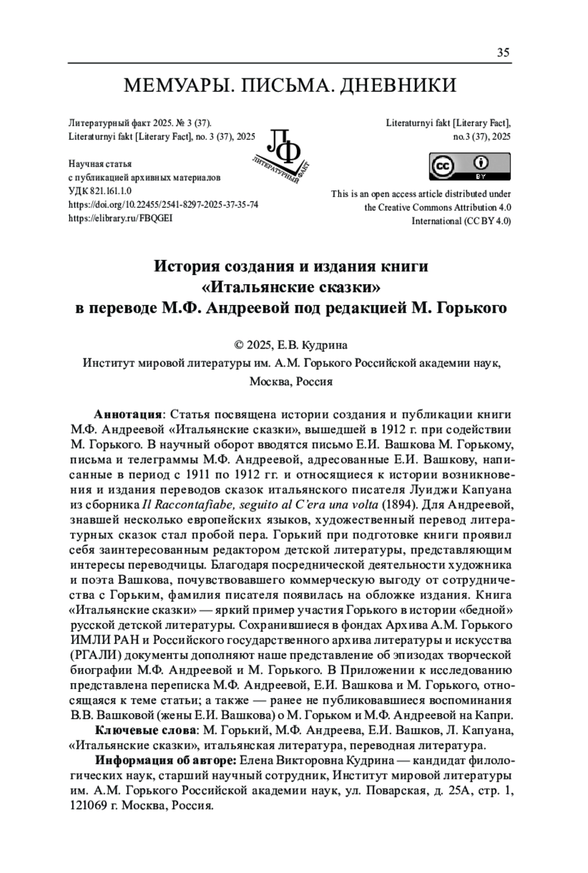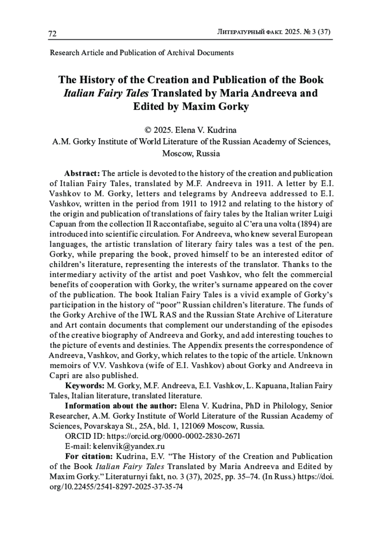 В научный оборот вводятся письмо Е. И. Вашкова М. Горькому, письма и телеграммы М. Ф. Андреевой, адресованные Е. И. Вашкову, написанные в период с 1911 по 1912 гг. и относящиеся к истории возникновения и издания переводов сказок итальянского писателя Луиджи Капуана из сборника Il Raccontafiabe, seguito al C’era una volta (1894). Для Андреевой, знавшей несколько европейских языков, художественный перевод литературных сказок стал пробой пера. Горький при подготовке книги проявил себя заинтересованным редактором детской литературы, представляющим интересы переводчицы. Благодаря посреднической деятельности художника и поэта Вашкова, почувствовавшего коммерческую выгоду от сотрудничества с Горьким, фамилия писателя появилась на обложке издания. Книга «Итальянские сказки» - яркий пример участия Горького в истории «бедной» русской детской литературы. Сохранившиеся в фондах Архива А. М. Горького ИМЛИ РАН и Российского государственного архива литературы и искусства (РГАЛИ) документы дополняют наше представление об эпизодах творческой биографии М. Ф. Андреевой и М. Горького. В Приложении к исследованию представлена переписка М. Ф. Андреевой, Е. И. Вашкова и М. Горького, относящаяся к теме статьи; а также - ранее не публиковавшиеся воспоминания В. В. Вашковой (жены Е. И. Вашкова) о М. Горьком и М. Ф. Андреевой на Капри.