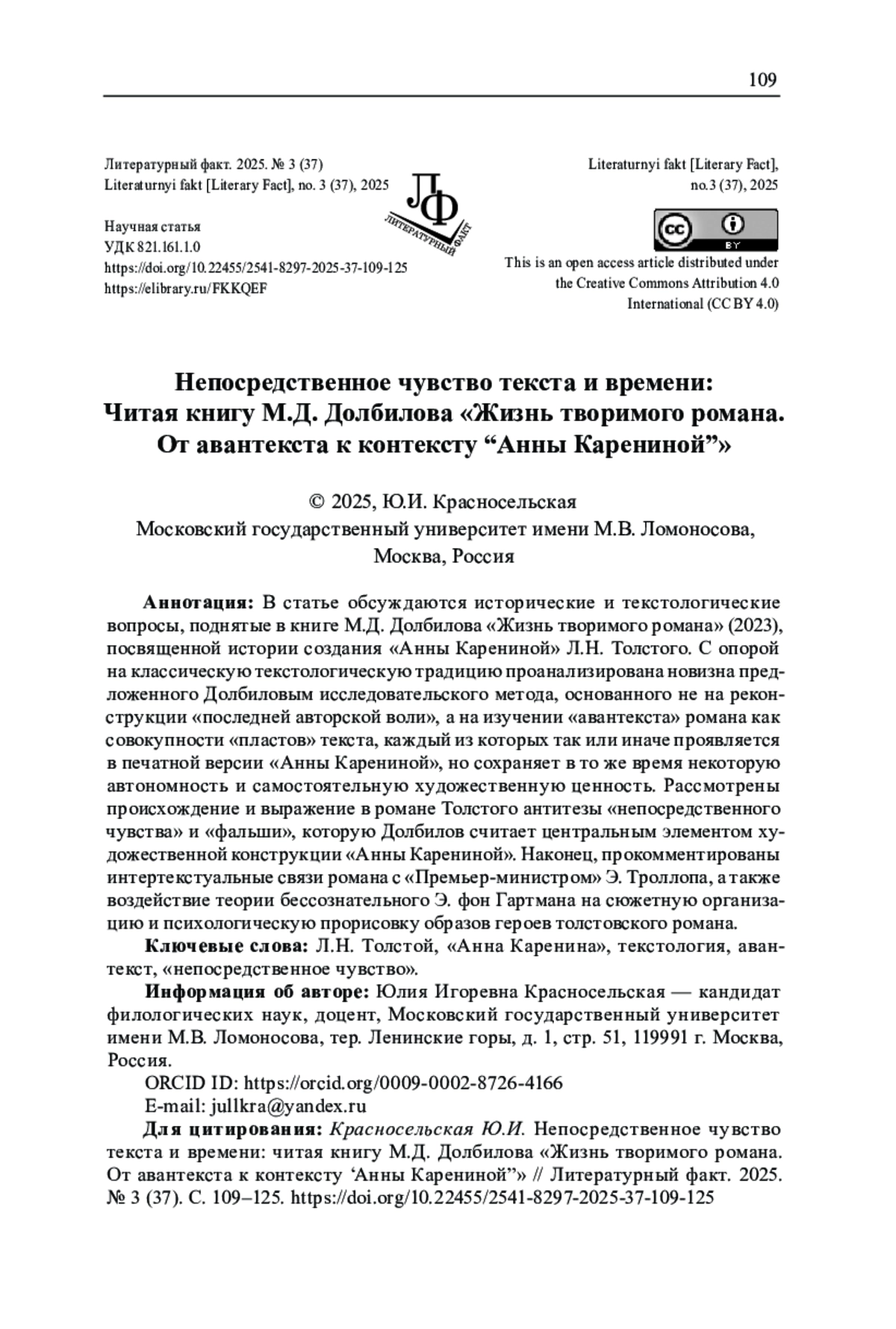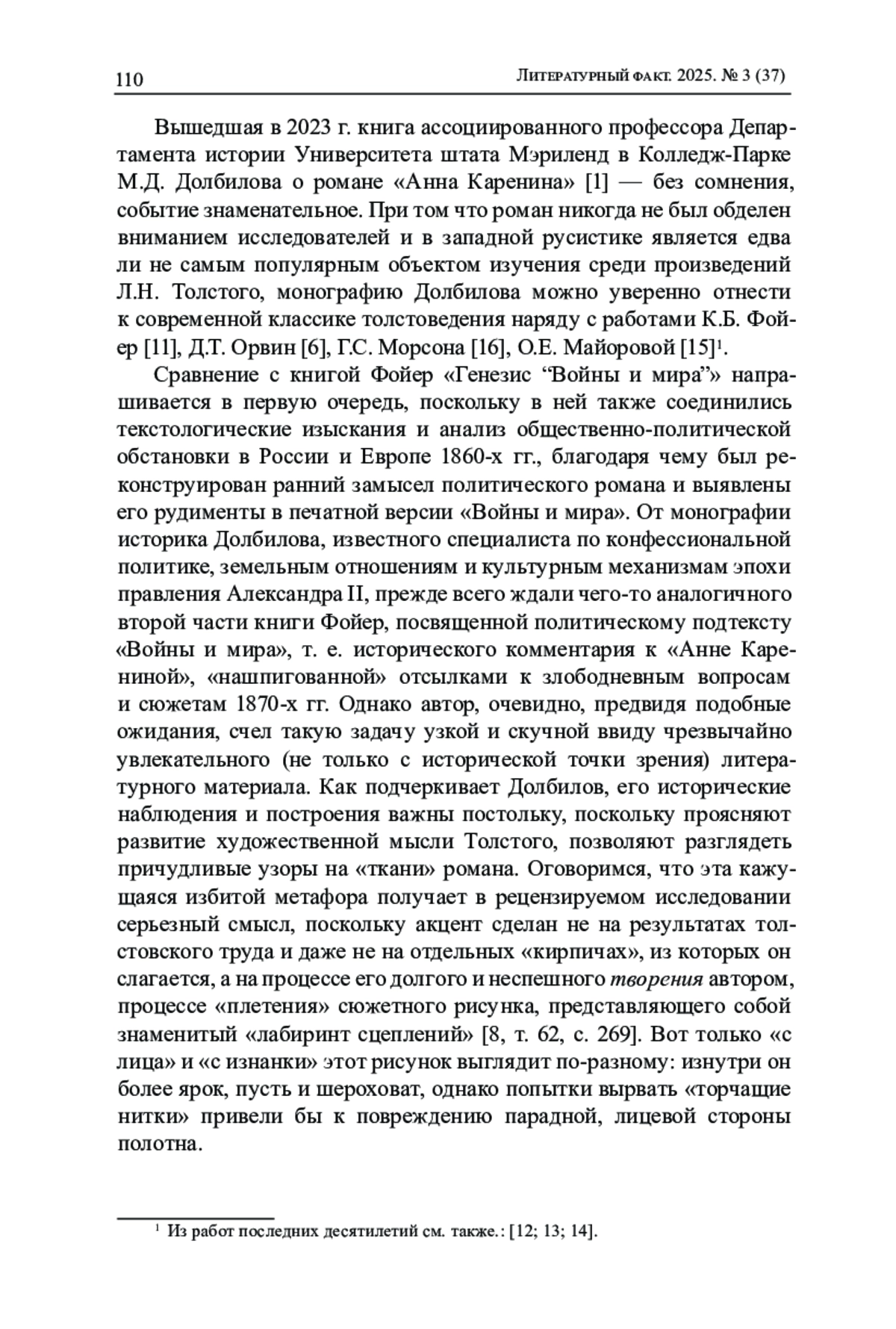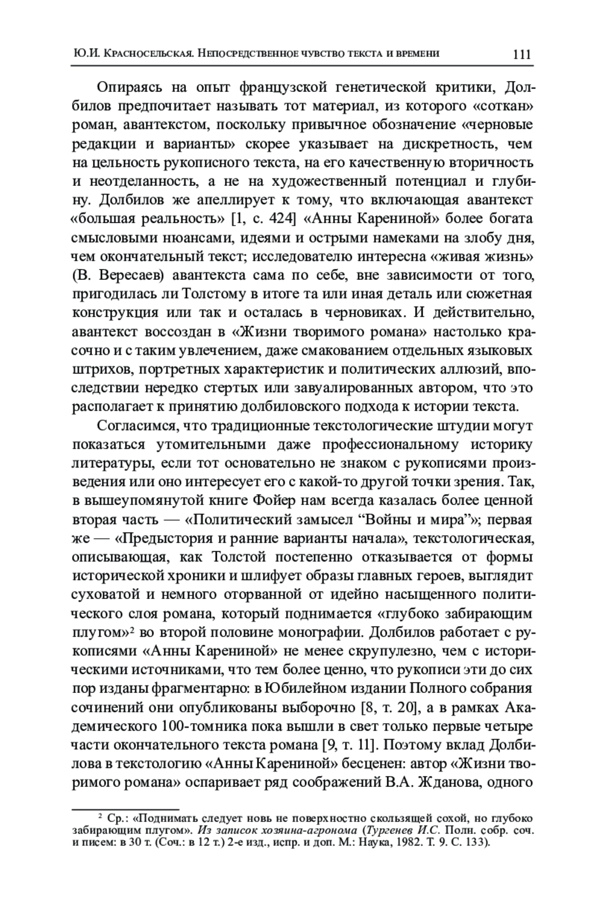 В статье обсуждаются исторические и текстологические вопросы, поднятые в книге М. Д. Долбилова «Жизнь творимого романа» (2023), посвященной истории создания «Анны Карениной» Л. Н. Толстого. С опорой на классическую текстологическую традицию проанализирована новизна предложенного Долбиловым исследовательского метода, основанного не на реконструкции «последней авторской воли», а на изучении «авантекста» романа как совокупности «пластов» текста, каждый из которых так или иначе проявляется в печатной версии «Анны Карениной», но сохраняет в то же время некоторую автономность и самостоятельную художественную ценность. Рассмотрены происхождение и выражение в романе Толстого антитезы «непосредственного чувства» и «фальши», которую Долбилов считает центральным элементом художественной конструкции «Анны Карениной». Наконец, прокомментированы интертекстуальные связи романа с «Премьер-министром» Э. Троллопа, а также воздействие теории бессознательного Э. фон Гартмана на сюжетную организацию и психологическую прорисовку образов героев толстовского романа.