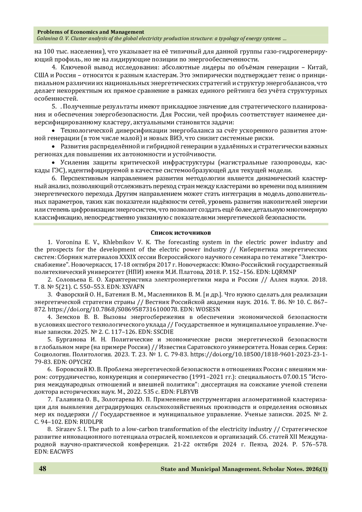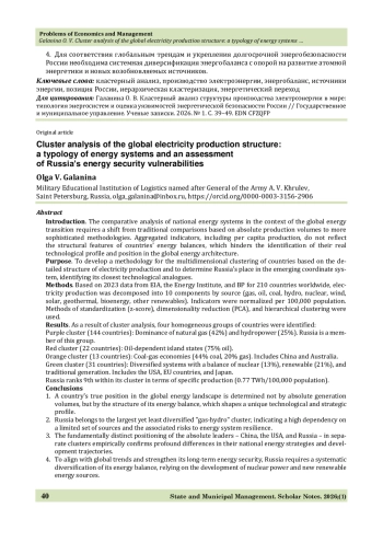 2. Россия принадлежит к самому многочисленному, но наименее диверсифицированному «газо-гидровому» кластеру, что указывает на высокую зависимость от ограниченного набора источников и связанные с этим риски для энергетической устойчивости.