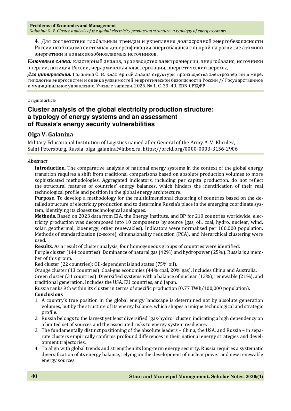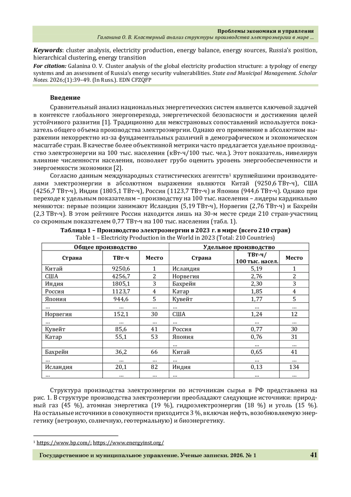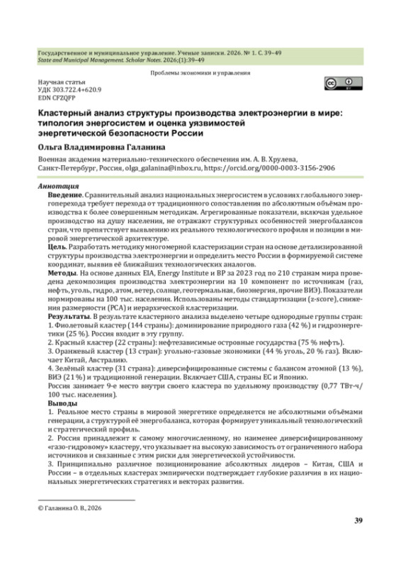 Сравнительный анализ национальных энергосистем в условиях глобального энергоперехода требует перехода от традиционного сопоставления по абсолютным объёмам производства к более совершенным методикам. Агрегированные показатели, включая удельное производство на душу населения, не отражают структурных особенностей энергобалансов стран, что препятствует выявлению их реального технологического профиля и позиции в мировой энергетической архитектуре.