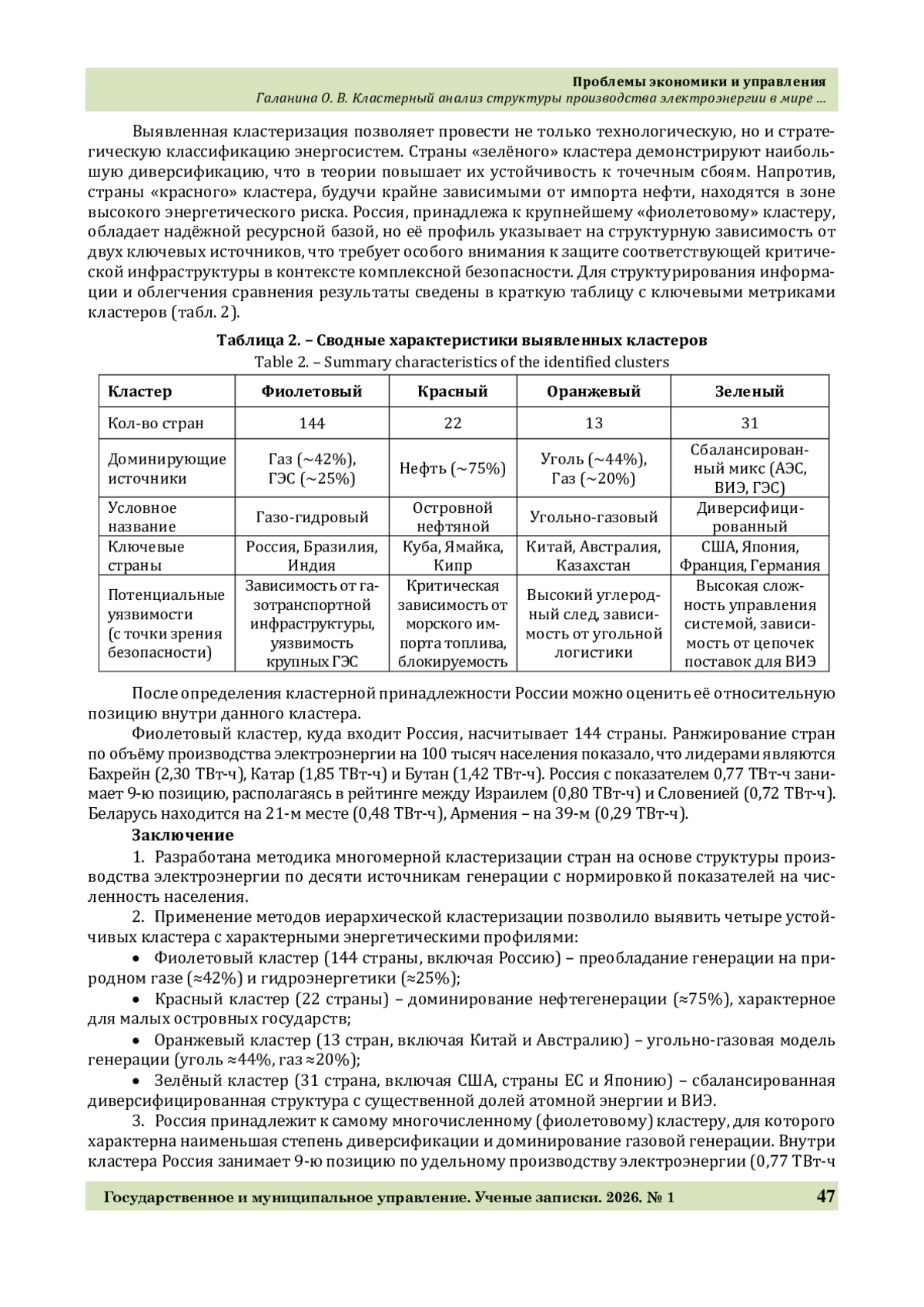 4. Зелёный кластер (31 страна): диверсифицированные системы с балансом атомной (13 %), ВИЭ (21 %) и традиционной генерации. Включает США, страны ЕС и Японию. Россия занимает 9-е место внутри своего кластера по удельному производству (0,77 ТВт-ч/ 100 тыс. населения).