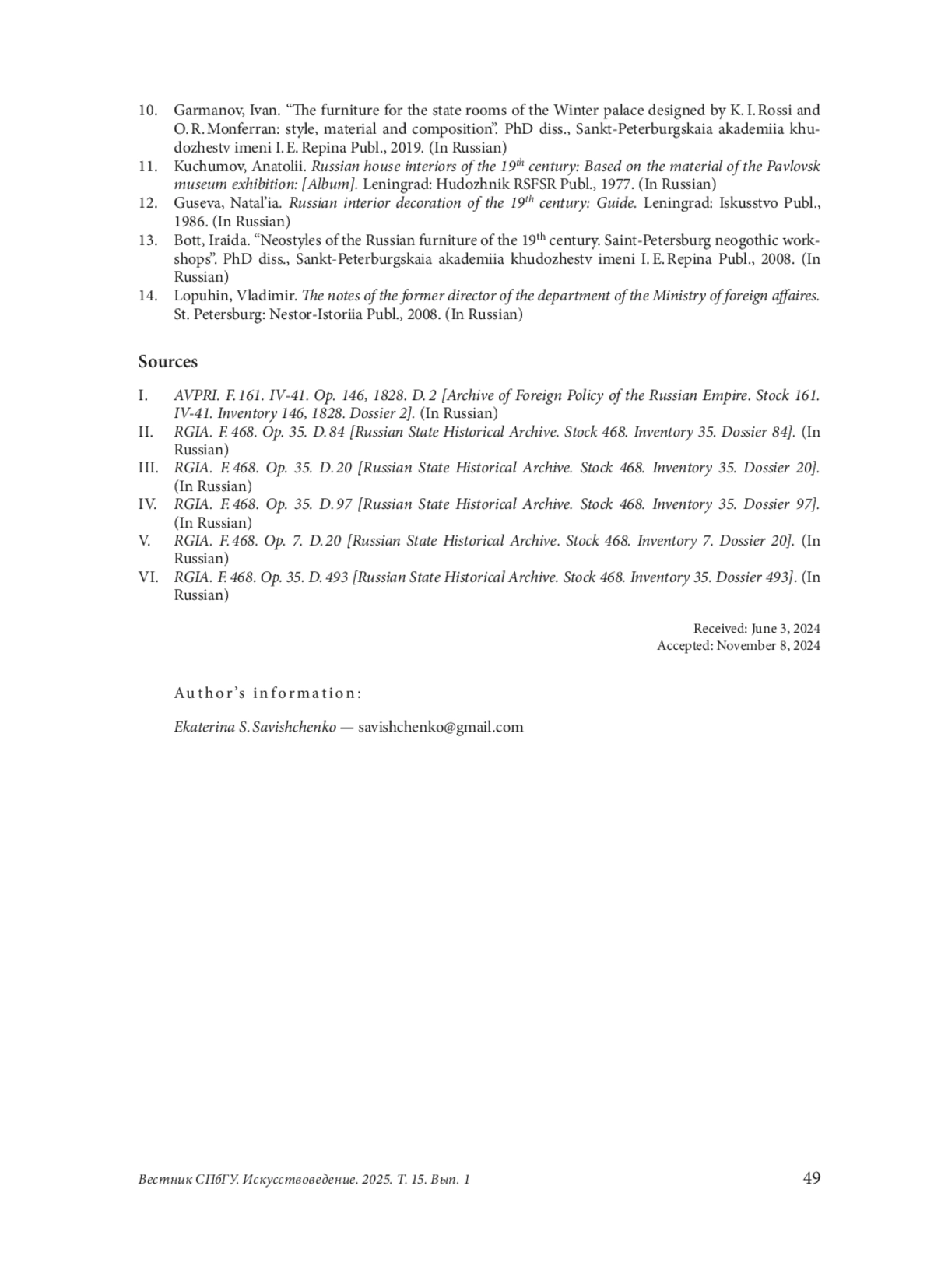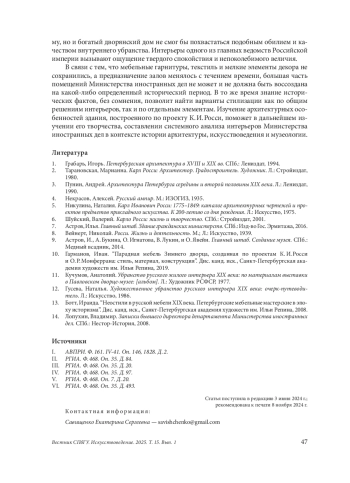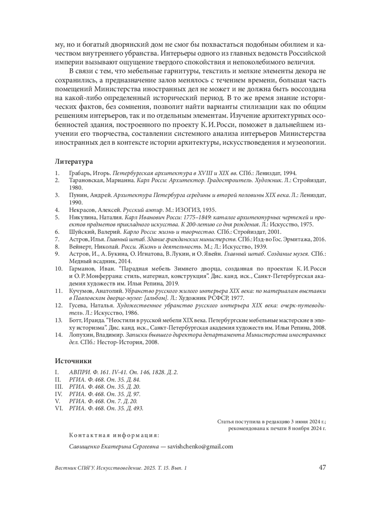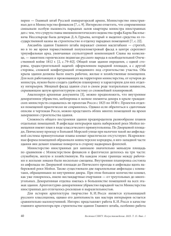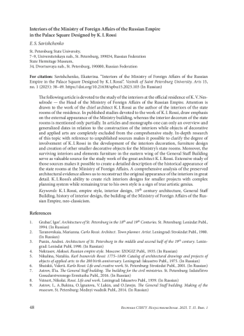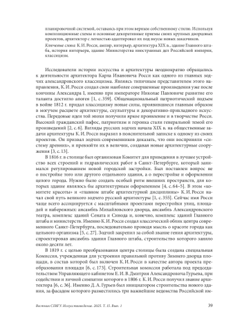 Статья посвящена изучению парадных интерьеров квартиры управляющего Министерством иностранных дел Российской империи К. В. Нессельроде в восточном крыле здания Главного штаба. Особое внимание уделяется работе главного архитектора здания и автора парадных интерьеров К. И. Росси. В опубликованных исследованиях, посвященных творчеству К. И. Росси, акцентируется именно внешний облик ансамбля Главного штаба. При этом внутреннее убранство парадных комнат описано частично. В статьях и монографиях можно встретить только общие сведения и датировки, касающиеся внутренней отделки, а предметы декоративно-прикладного искусства вовсе исключены из комплексного исследования. Целостное изучение этой темы с обращением к неопубликованным источникам позволяет уточнить степень вовлечения К. И. Росси в разработку отделки интерьеров, мебели и других мелких предметов декоративно-прикладного искусства министерской квартиры. Кроме того, сохранившиеся до наших дней интерьеры и фрагменты меблировки помещений в восточном крыле здания Главного штаба служат ценнейшим источником для исследования творчества великого зодчего К. И. Росси. Комплексный анализ сохранившегося архитектурнохудожественного облика министерской квартиры с привлечением ряда источников позволяет достаточно детально реконструировать ее вид. Проект парадных комнат министерской квартиры свидетельствует о мастерстве К. И. Росси и его умении создавать торжественные интерьеры на небольших по площади пространствах со сложной планировочной системой, оставаясь при этом верным собственному стилю. Используя композиционные схемы и основные декоративные приемы своих крупных дворцовых проектов, архитектор с легкостью адаптировал их под вкусы новых заказчиков