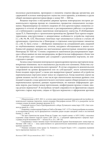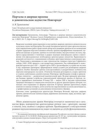 Выделены основные виды наружных и внутренних дверных проемов в домонгольском культовом зодчестве Новгорода. На основе материалов архитектурно-археологических и реставрационных работ представлен обзор всех подвидов проемов по их назначению в храме: парадные порталы основного объема, проемы периферийных помещений, технические выходы на кровлю, проемы лестничных башен, внутристенных лестниц, хор. Дается представление о типичных и редких подходах новгородских зодчих к выполнению этих функционально необходимых архитектурных элементов. Вариативность решений соотносится с изменениями в объемно-пространственных композициях храмов. Уникальная и менявшаяся в ходе строительства сложная структура Софийского собора (1045–1050) привела к нестандартным решениям. Ряд нововведений в новгородской архитектуре в XII — первой трети ХIII в. (разнообразие в устройстве лестниц и хор, появление притворов) сформировали новые условия для размещения дверных проемов. Особое внимание уделено конструктивным и декоративным особенностям порталов новгородских построек. Отмечены большая регулярность кладок притолок и в целом свойственное домонгольскому Новгороду преобладание плинф в криволинейных элементах — разгрузочной надпортальной арке. На ряде примеров прослежены базовые приемы устройства горизонтальной перемычки проема из брусьев, порога и деревянного заполнения. В конце XII — начале XIII в. местная строительная традиция обогащается творческим импульсом из других архитектурных центров, что находит свое отражение и в формах порталов. В прежде прямых притолоках сперва появляется выемка четверть, затем количество перспективных уступов увеличивается, а профилировка усложняется дополнением полуколонок и бровки