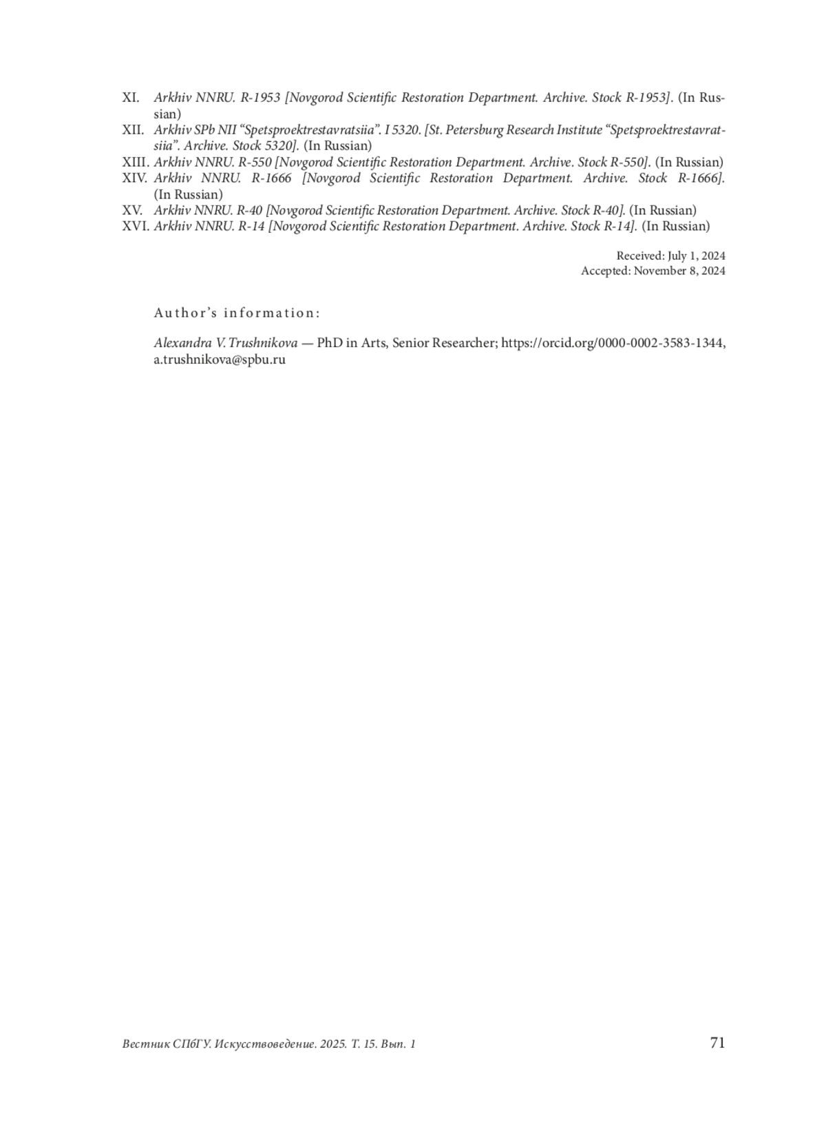 26. Коваленко, Ольга, и Лилия Маркова. “Церковь Андрея Стратилата в Новгородском кремле: Проектные исследования и реставрация”. Труды Государственного Эрмитажа, no. 46 (2009): 286-8.