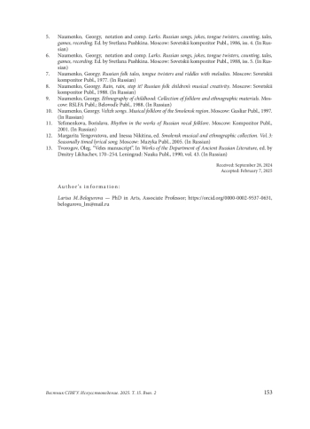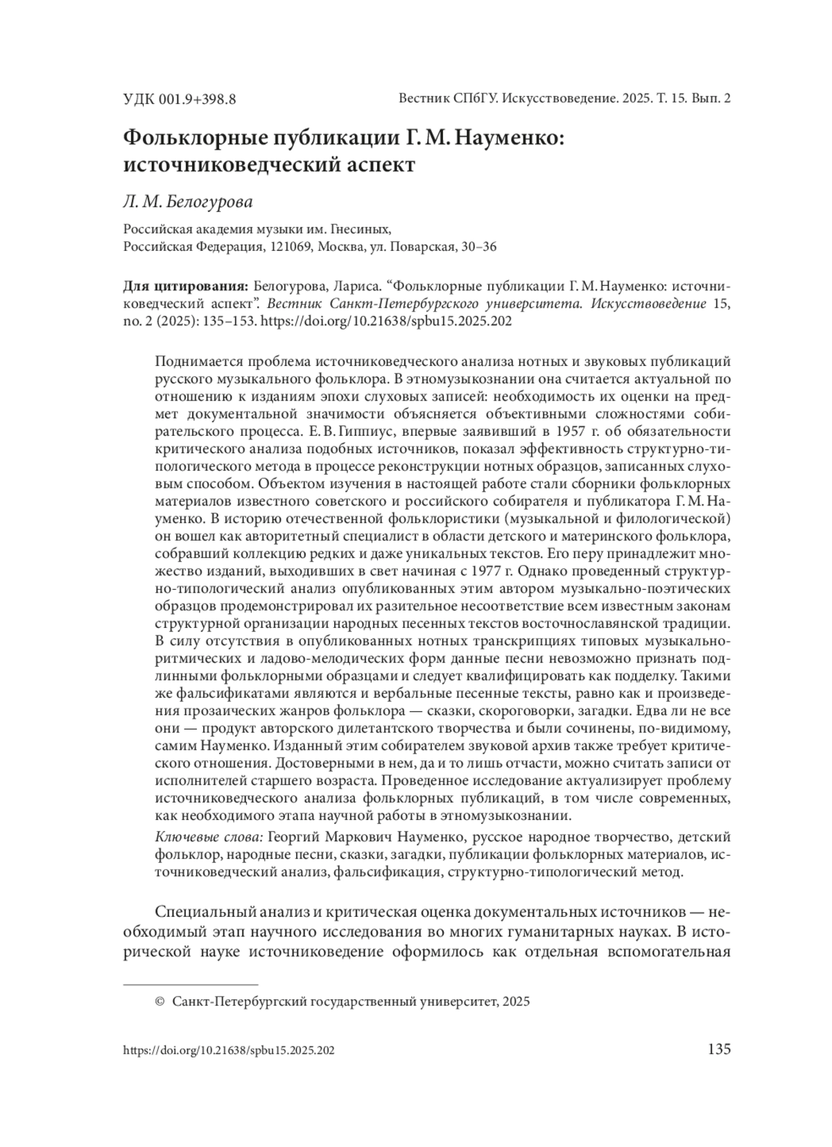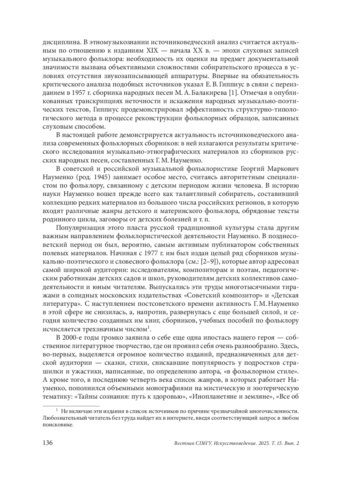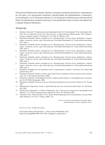Поднимается проблема источниковедческого анализа нотных и звуковых публикаций русского музыкального фольклора. В этномузыкознании она считается актуальной по отношению к изданиям эпохи слуховых записей: необходимость их оценки на предмет документальной значимости объясняется объективными сложностями собирательского процесса. Е. В. Гиппиус, впервые заявивший в 1957 г. об обязательности критического анализа подобных источников, показал эффективность структурно-типологического метода в процессе реконструкции нотных образцов, записанных слуховым способом. Объектом изучения в настоящей работе стали сборники фольклорных материалов известного советского и российского собирателя и публикатора Г. М. Науменко. В историю отечественной фольклористики (музыкальной и филологической) он вошел как авторитетный специалист в области детского и материнского фольклора, собравший коллекцию редких и даже уникальных текстов. Его перу принадлежит множество изданий, выходивших в свет начиная с 1977 г. Однако проведенный структурно-типологический анализ опубликованных этим автором музыкально-поэтических образцов продемонстрировал их разительное несоответствие всем известным законам структурной организации народных песенных текстов восточнославянской традиции. В силу отсутствия в опубликованных нотных транскрипциях типовых музыкальноритмических и ладово-мелодических форм данные песни невозможно признать подлинными фольклорными образцами и следует квалифицировать как подделку. Такими же фальсификатами являются и вербальные песенные тексты, равно как и произведения прозаических жанров фольклора — сказки, скороговорки, загадки. Едва ли не все они — продукт авторского дилетантского творчества и были сочинены, по-видимому, самим Науменко. Изданный этим собирателем звуковой архив также требует критического отношения. Достоверными в нем, да и то лишь отчасти, можно считать записи от исполнителей старшего возраста. Проведенное исследование актуализирует проблему источниковедческого анализа фольклорных публикаций, в том числе современных, как необходимого этапа научной работы в этномузыкознании