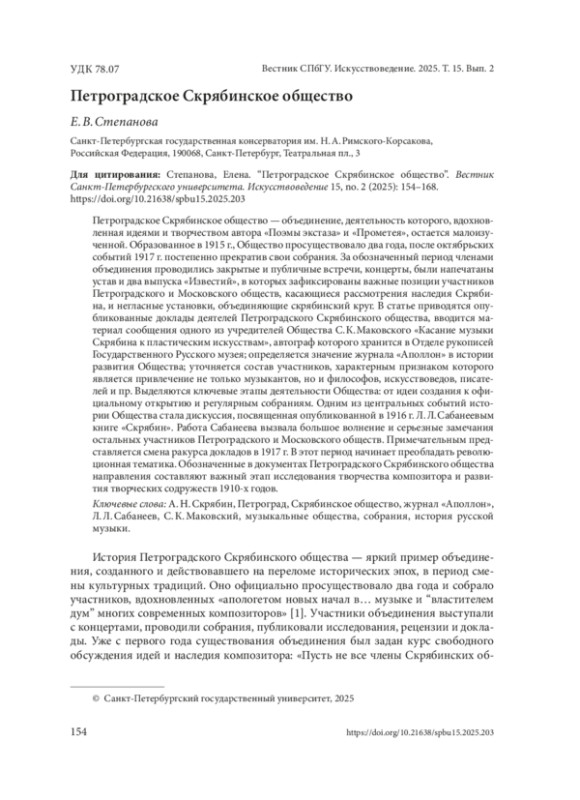 Петроградское Скрябинское общество — объединение, деятельность которого, вдохновленная идеями и творчеством автора «Поэмы экстаза» и «Прометея», остается малоизученной. Образованное в 1915 г., Общество просуществовало два года, после октябрьских событий 1917 г. постепенно прекратив свои собрания. За обозначенный период членами объединения проводились закрытые и публичные встречи, концерты, были напечатаны устав и два выпуска «Известий», в которых зафиксированы важные позиции участников Петроградского и Московского обществ, касающиеся рассмотрения наследия Скрябина, и негласные установки, объединяющие скрябинский круг. В статье приводятся опубликованные доклады деятелей Петроградского Скрябинского общества, вводится материал сообщения одного из учредителей Общества С. К. Маковского «Касание музыки Скрябина к пластическим искусствам», автограф которого хранится в Отделе рукописей Государственного Русского музея; определяется значение журнала «Аполлон» в истории развития Общества; уточняется состав участников, характерным признаком которого является привлечение не только музыкантов, но и философов, искусствоведов, писателей и пр. Выделяются ключевые этапы деятельности Общества: от идеи создания к официальному открытию и регулярным собраниям. Одним из центральных событий истории Общества стала дискуссия, посвященная опубликованной в 1916 г. Л. Л. Сабанеевым книге «Скрябин». Работа Сабанеева вызвала большое волнение и серьезные замечания остальных участников Петроградского и Московского обществ. Примечательным представляется смена ракурса докладов в 1917 г. В этот период начинает преобладать революционная тематика. Обозначенные в документах Петроградского Скрябинского общества направления составляют важный этап исследования творчества композитора и развития творческих содружеств 1910-х годов.