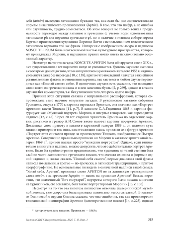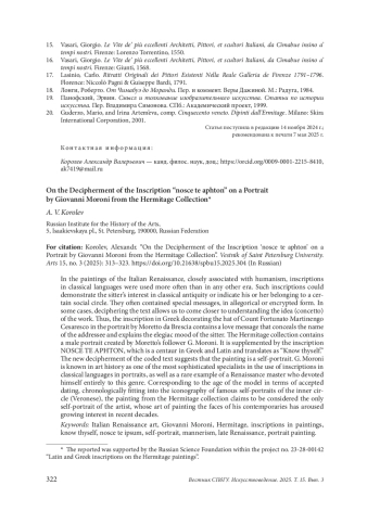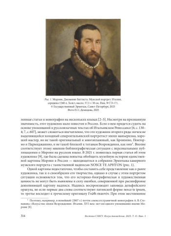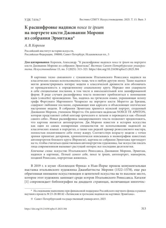 В картинах тесно связанного с гуманизмом Итальянского Ренессанса надписи на классических языках использовались чаще, чем в любую другую эпоху. Такие надписи могли демонстрировать интерес модели к классической древности или обозначать ее принадлежность к определенному социальному кругу. Нередко они содержали в себе специальные послания, в том числе в иносказательной или зашифрованной форме. В ряде случаев расшифровка текста позволяет приблизиться к пониманию идеи (concetto) произведения. Так, надпись на греческом языке, украшающая шляпу графа Фортунато Мартиненго Чезареско на портрете кисти Моретто да Брешиа, содержит любовное послание, скрывающее имя адресата и объясняющее элегическое настроение модели. В собрании Эрмитажа хранится мужской портрет, созданный Джованни Морони, учеником Моретто. Он дополнен надписью NOSCE TE APHTON, которая представляет собой кентавр греческого и латыни и переводится как «Познай самого себя». Новая расшифровка закодированного текста позволяет предположить, что картина является автопортретом. Дж. Морони известен в истории искусства как один из самых изощренных специалистов по использованию надписей на классических языках в портретах, а также как редкий пример ренессансного мастера, полностью посвятившего себя этому жанру. Соответствуя возрасту модели с точки зрения принятых датировок, хронологически вписываясь в иконографию известных автопортретов близкого круга (Веронезе), картина из собрания Эрмитажа претендует на то, чтобы считаться единственным автопортретом художника, чье искусство писать лица современников вызывает растущий интерес все последние десятилетия.