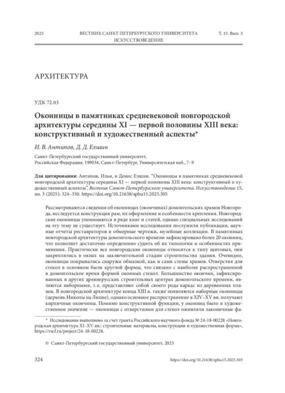 13. Antipov, Ilya. “Wooden elements in the Stone Architecture of Medieval Novgorod”. In Historic Wooden Architecture in Europe and Russia. Evidence, Study and Restoration, eds Evgeny Khodakovsky and Siri Skjold Lexau, 122-33. Basel: Birkäuser, 2016. DOI: 10.1515/9783035605426-010