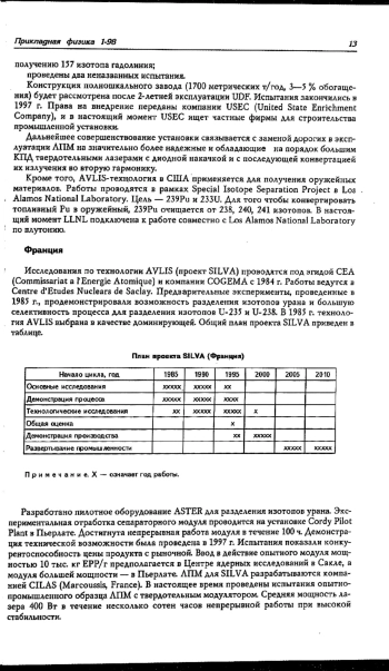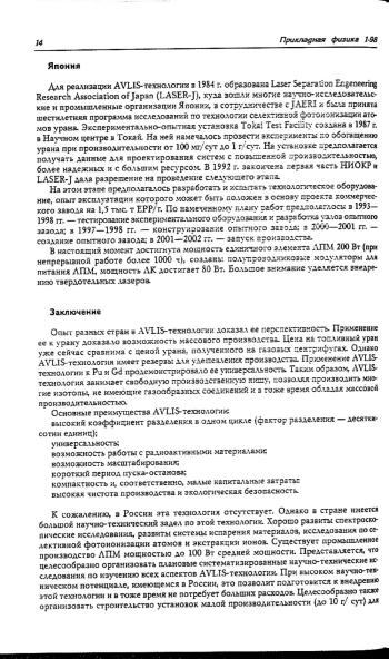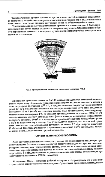 Рассматриваются принципиальные возможности AVLIS-технологии, основанной на изотопически селективной фотоионизации атомов выделяемого изотопа лазерным излучением. Для трех основных блоков технологии: испарения, фотоионизации и экстракции ионов выделяемого изотопа, обсуждается перечень научно-технических исследований, необходимых для его внедрения в практику. Приведены результаты развития этой технологии в промышленно развитых странах мира, где в основном ведутся работы по применению этой технологии для промышленного разделения изотопов урана