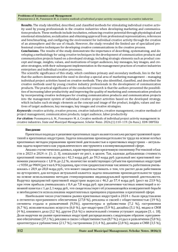 Цель. На основе вторичного исследования статистических данных о креативных индустриях Ростовской области обосновать необходимость, разработать и провести первичное исследование в виде эксперимента, направленного на выявление особенностей индивидуального креативного процесса в маркетингово-коммуникационной сфере и методов стимулирования индивидуальной креативной деятельности при проектировании маркетингово-коммуникационных продуктов.