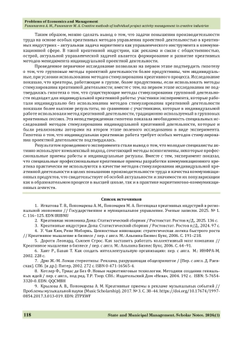 Выводы. Научная значимость проведенного исследования состоит в том, что авторы доказали необходимость формирования особого направления маркетинг-менеджмента – управления индивидуальной проектной деятельностью на основе использования креативных методов, выявили, классифицировали и описали креативные методы, используемые молодыми специалистами креативных индустрий при разработке коммуникационных продуктов.