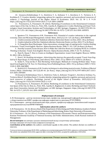 11. Ponomareva, A., Ponomarev, M. (2022). Marketing of Loneliness in the Omnichannel Communication Space of the City. In: Reis, J.L., Peter, M.K., Cayolla, R., Bogdanović, Z. (eds). Marketing and Smart Technologies. Smart Innovation, Systems and Technologies, vol 280. Springer, Singapore. 10.1007/978-981-16-9272-7_21. P. 251-263. https://doi.org/10.1007/978-981-16-9272-7_21P.251-263.