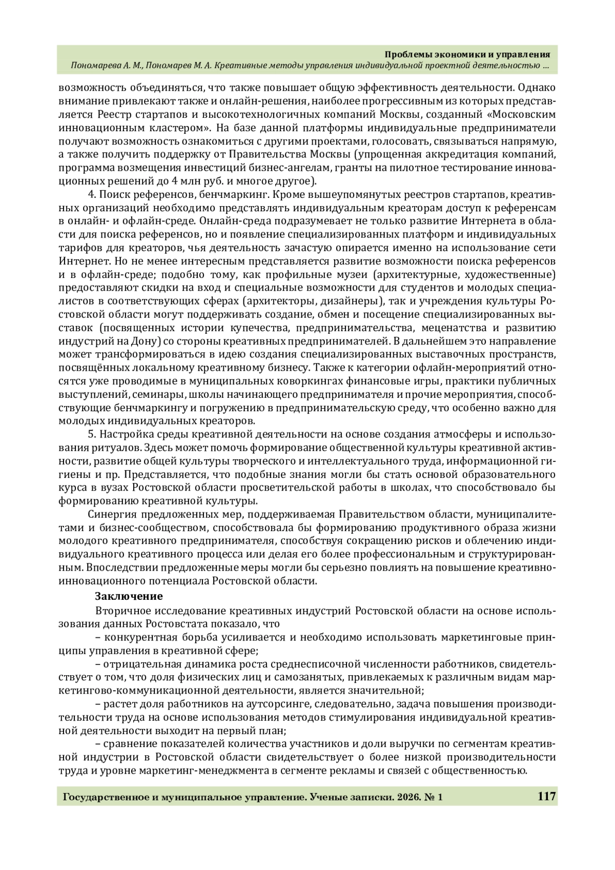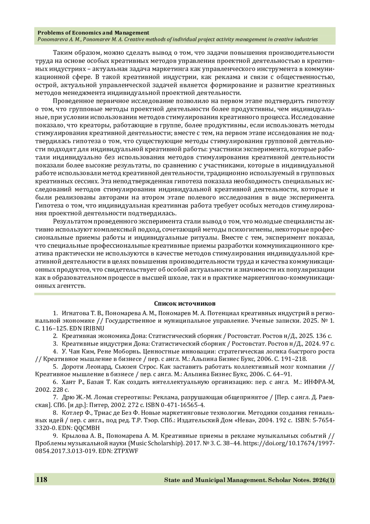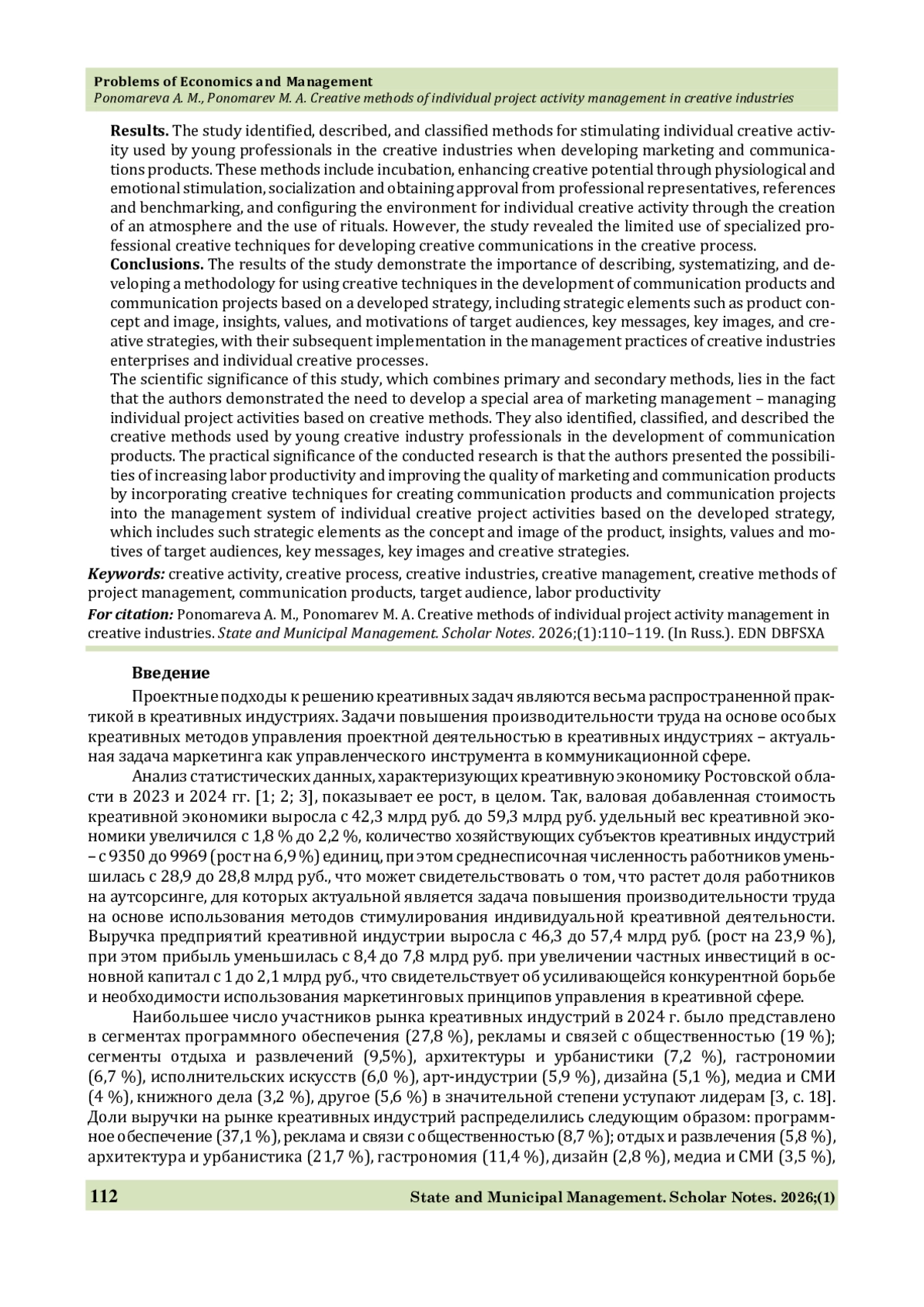 1. Игнатова Т. В., Пономарева А. М., Пономарев М. А. Потенциал креативных индустрий в региональной экономике // Государственное и муниципальное управление. Ученые записки. 2025. № 1. С. 116-125.
