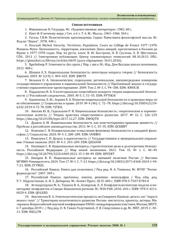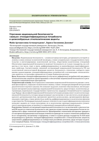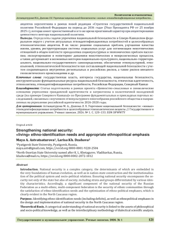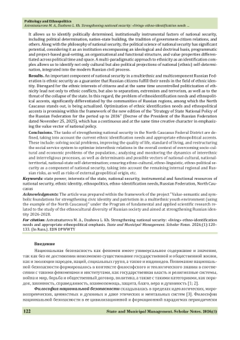 Результаты. Важной составляющей национальной безопасности в полиэтничной и многосоставной РФ является этническая безопасность как гарантия осуществления гражданами России их потребностей в сфере этнической идентичности. Пренебрежение этническими интересами граждан и в то же время неуправляемая политизация этничности приводят не только к этнических конфликтам, но и к сепаратизму, экстремизму и терроризму, а также и к угрозе распада государства. В этой связи актуализируется проблема этноидентификационных потребностей и этнополитических акцентов, существенно дифференцированных по сообществам российских регионов, среди которых выделяется Северный Кавказ. Оптимизация этноидентификационных потребностей и этнополитических акцентов перспективна в рамках новой редакции «Стратегии государственной национальной политики Российской Федерации на период до 2036 года» (Указ Президента РФ от 25 ноября 2025 г.), которая имеет преемственный и в то же время креативный характер при акцентировании ценностного вектора национальной политики.