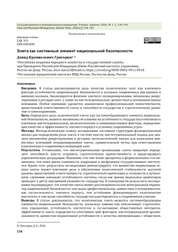 Цель. Определить роль политической элиты как системообразующего элемента национальной безопасности, выявить механизмы её влияния на устойчивость государства и обосновать ключевые институциональные, аксиологические и коммуникативные факторы, определяющие качество и эффективность элитного корпуса в условиях современных угроз.
