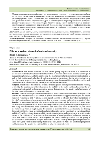 Результаты. Установлено, что институциональная организация элиты напрямую определяет способность власти сохранять стратегическую преемственность и предотвращать управленческую деградацию. Выявлено, что чем более прозрачны и формализованы эти механизмы, тем ниже риски клановости, коррупции и дисфункции государственных институтов. Кроме того, результаты исследования демонстрируют, что ценностно-нормативная основа элиты играет ключевую роль в обеспечении политической стабильности: высокий уровень нравственной ответственности, стратегической ориентации и готовности к публичному служению повышает устойчивость системы, тогда как эрозия моральных ориентиров приводит к росту внутренней уязвимости государства. В совокупности результаты исследования подтверждают, что качество элиты может рассматриваться как интегральный индикатор национальной безопасности: чем выше профессиональная, ценностная и коммуникативная состоятельность элитного корпуса, тем устойчивее функционируют политические институты и тем выше способность государства адаптироваться к современным угрозам.