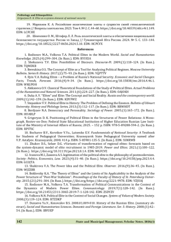 19. Маркелов К. А. Российские политические элиты о сущности своей геополитической стратегии // Вопросы элитологии. 2023. Том 4. № 2. С. 44-60. https://doi.org/10.46539/elit.v4i1.149.