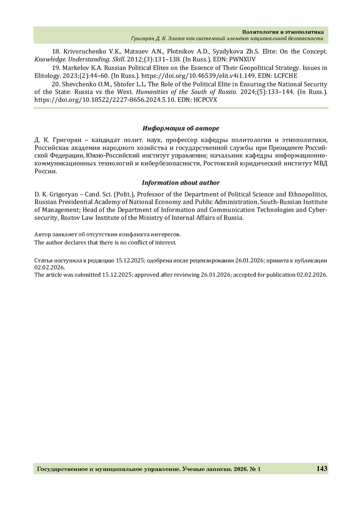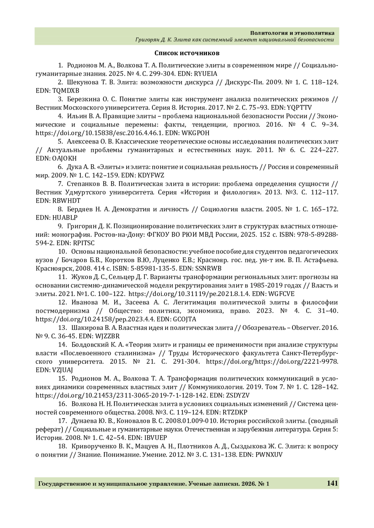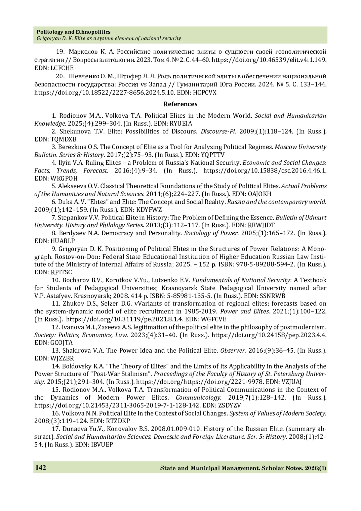 9. Григорян Д. К. Позиционирование политических элит в структурах властных отношений: монография. Ростов-на-Дону: ФГКОУ ВО РЮИ МВД России, 2025. 152 с. ISBN: 978-5-89288-594-2.