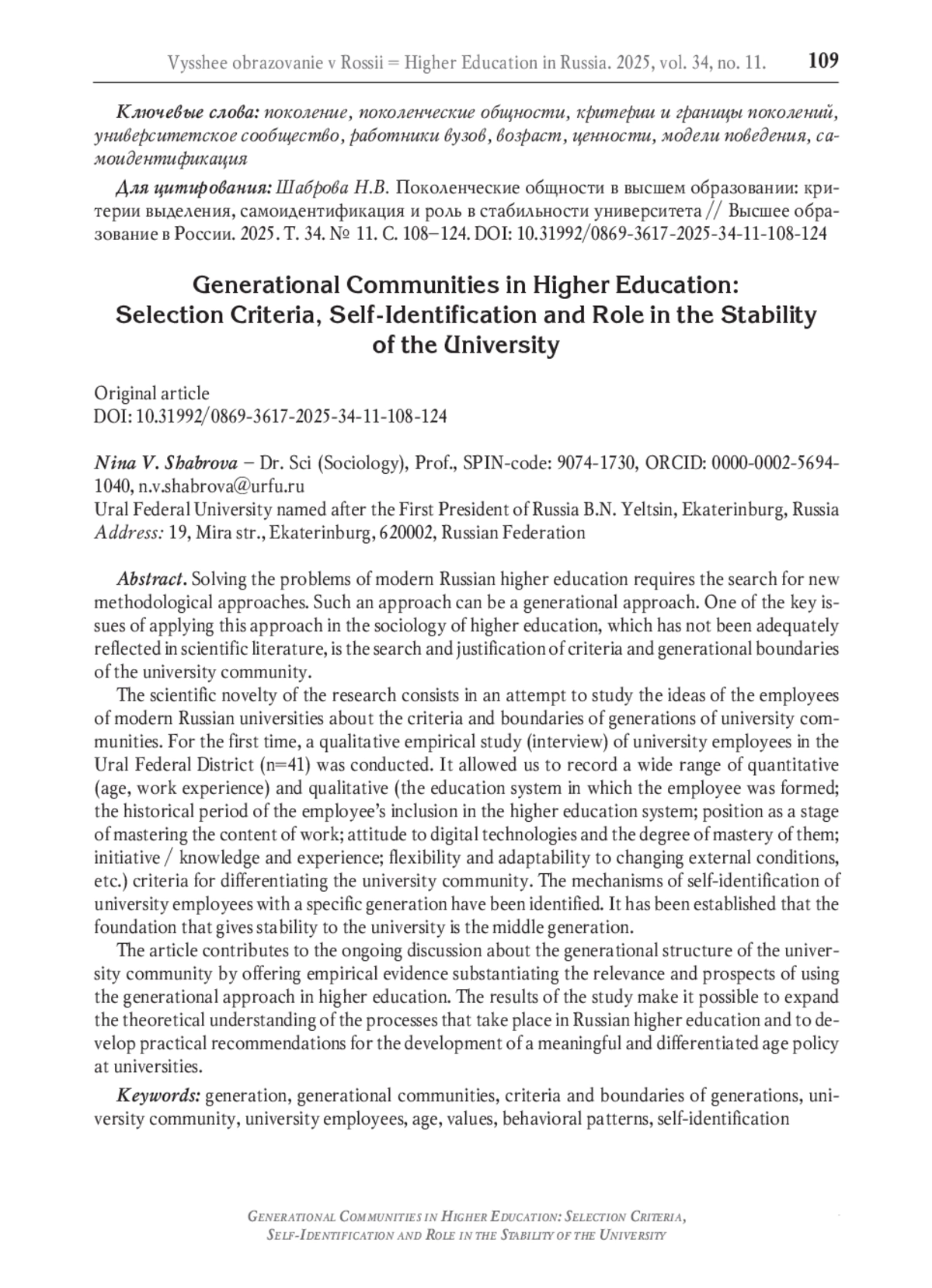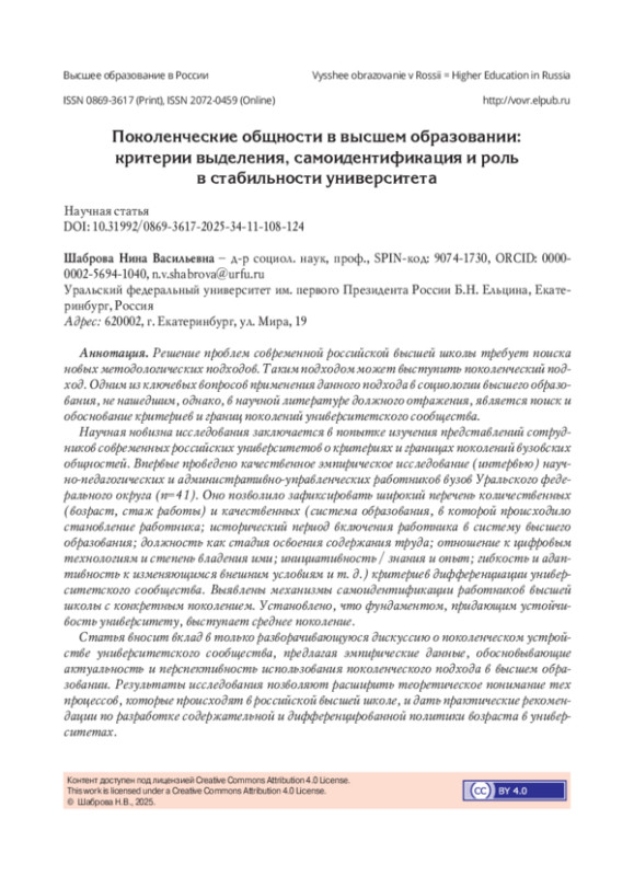 Решение проблем современной российской высшей школы требует поиска новых методологических подходов. Таким подходом может выступить поколенческий подход. Одним из ключевых вопросов применения данного подхода в социологии высшего образования, не нашедшим, однако, в научной литературе должного отражения, является поиск и обоснование критериев и границ поколений университетского сообщества. Научная новизна исследования заключается в попытке изучения представлений сотрудников современных российских университетов о критериях и границах поколений вузовских общностей. Впервые проведено качественное эмпирическое исследование (интервью) научно-педагогических и административно-управленческих работников вузов Уральского федерального округа (n=41). Оно позволило зафиксировать широкий перечень количественных (возраст, стаж работы) и качественных (система образования, в которой происходило становление работника; исторический период включения работника в систему высшего образования; должность как стадия освоения содержания труда; отношение к цифровым технологиям и степень владения ими; инициативность / знания и опыт; гибкость и адаптивность к изменяющимся внешним условиям и т. д.) критериев дифференциации университетского сообщества. Выявлены механизмы самоидентификации работников высшей школы с конкретным поколением. Установлено, что фундаментом, придающим устойчивость университету, выступает среднее поколение. Статья вносит вклад в только разворачивающуюся дискуссию о поколенческом устройстве университетского сообщества, предлагая эмпирические данные, обосновывающие актуальность и перспективность использования поколенческого подхода в высшем образовании. Результаты исследования позволяют расширить теоретическое понимание тех процессов, которые происходят в российской высшей школе, и дать практические рекомендации по разработке содержательной и дифференцированной политики возраста в университетах.