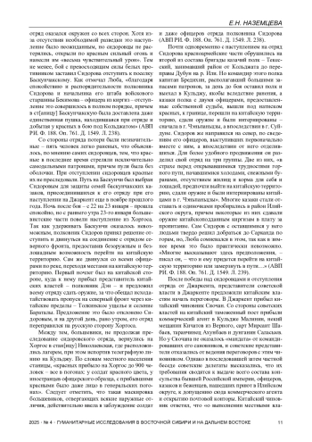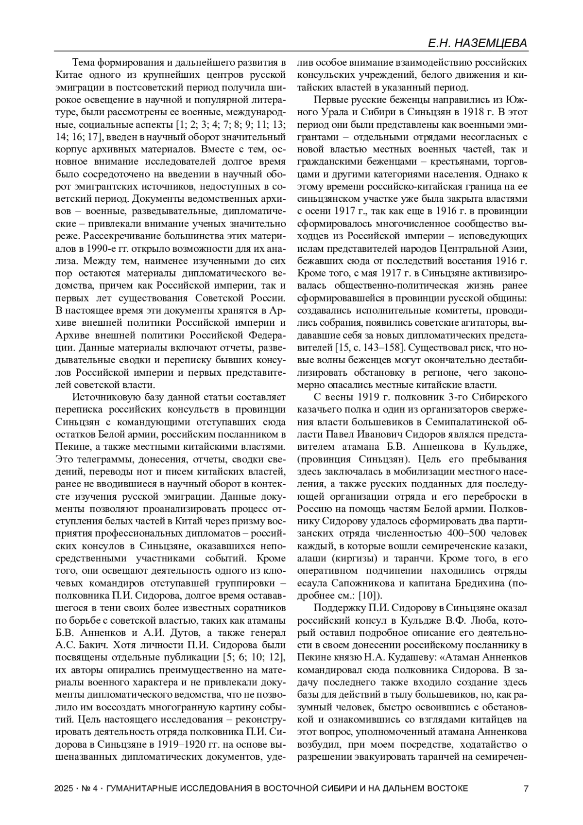 В статье на основе архивных документов дипломатического ведомства реконструируется деятельность отряда полковника П. И. Сидорова в Китае в период 1919–1922 гг. Исследование охватывает все этапы существования отряда: от формирования и военных операций в Семиречье до окончательного краха антибольшевистского движения в Синьцзяне. В центре внимания автора – военная, дипломатическая и политическая деятельность Сидорова, его взаимодействие с консульскими учреждениями бывшей Российской империи, китайскими властями и другими представителями белого движения. Документы свидетельствуют о том, что полковник сумел наладить эффективное взаимодействие с местным населением и китайскими властями, однако, несмотря на проявленные Сидоровым талант военачальника и дипломата, его отряд не смог противостоять превосходящим силам противника.