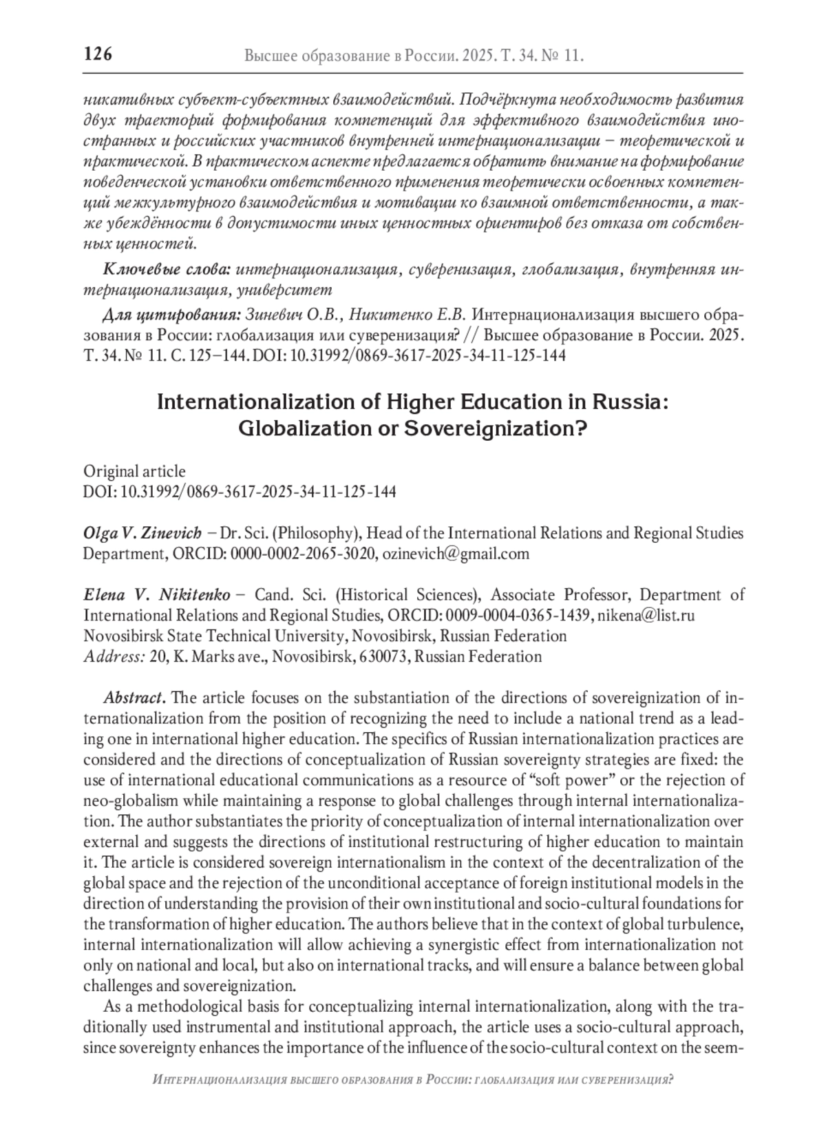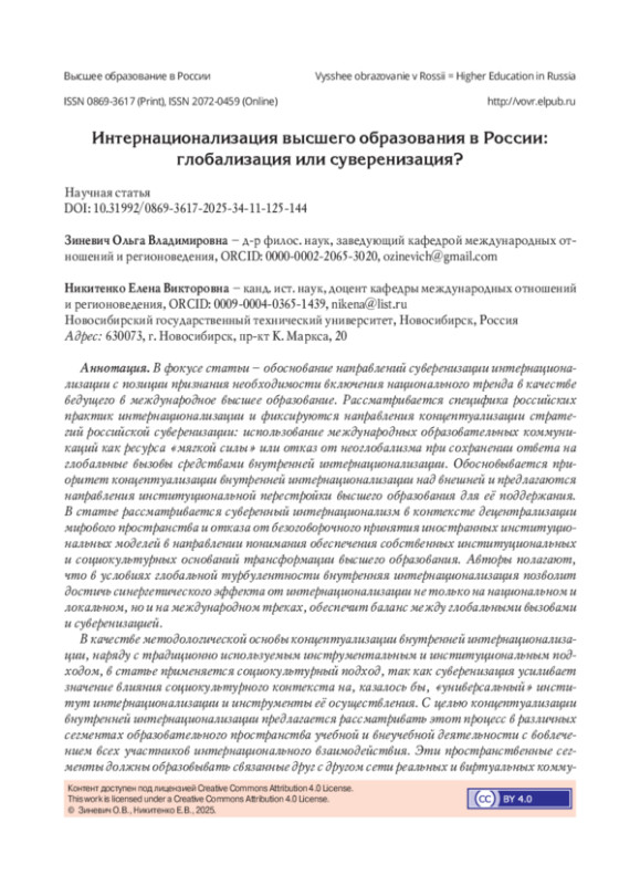 В фокусе статьи - обоснование направлений суверенизации интернационализации с позиции признания необходимости включения национального тренда в качестве ведущего в международное высшее образование. Рассматривается специфика российских практик интернационализации и фиксируются направления концептуализации стратегий российской суверенизации: использование международных образовательных коммуникаций как ресурса «мягкой силы» или отказ от неоглобализма при сохранении ответа на глобальные вызовы средствами внутренней интернационализации. Обосновывается приоритет концептуализации внутренней интернационализации над внешней и предлагаются направления институциональной перестройки высшего образования для её поддержания. В статье рассматривается суверенный интернационализм в контексте децентрализации мирового пространства и отказа от безоговорочного принятия иностранных институциональных моделей в направлении понимания обеспечения собственных институциональных и социокультурных оснований трансформации высшего образования. Авторы полагают, что в условиях глобальной турбулентности внутренняя интернационализация позволит достичь синергетического эффекта от интернационализации не только на национальном и локальном, но и на международном треках, обеспечит баланс между глобальными вызовами и суверенизацией. В качестве методологической основы концептуализации внутренней интернационализации, наряду с традиционно используемым инструментальным и институциональным подходом, в статье применяется социокультурный подход, так как суверенизация усиливает значение влияния социокультурного контекста на, казалось бы, «универсальный» институт интернационализации и инструменты её осуществления. С целью концептуализации внутренней интернационализации предлагается рассматривать этот процесс в различных сегментах образовательного пространства учебной и внеучебной деятельности с вовлечением всех участников интернационального взаимодействия. Эти пространственные сегменты должны образовывать связанные друг с другом сети реальных и виртуальных коммуникативных субъект-субъектных взаимодействий. Подчёркнута необходимость развития двух траекторий формирования компетенций для эффективного взаимодействия иностранных и российских участников внутренней интернационализации - теоретической и практической. В практическом аспекте предлагается обратить внимание на формирование поведенческой установки ответственного применения теоретически освоенных компетенций межкультурного взаимодействия и мотивации ко взаимной ответственности, а также убеждённости в допустимости иных ценностных ориентиров без отказа от собственных ценностей.