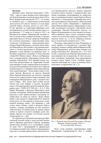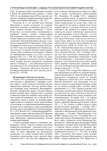 Статья посвящена комплексному анализу роли великого князя Николая Николаевича (Младшего) в консолидации русской военной эмиграцией на Дальнем Востоке и руководстве ею в 1922-1929 гг. Целью исследования является выявление и характеристика форм, методов и результатов его политического и организационного влияния на эмигрантские структуры в Китае, прежде всего в рамках Русского Обще-Воинского Союза. На основе широкого круга архивных документов, материалов эмигрантской прессы и воспоминаний автор прослеживает эволюцию взаимоотношений между великим князем, находившимся во Франции, и его сторонниками в Шанхае, Харбине и Маньчжурии. В работе показано, как Николай Николаевич, первоначально дистанцировавшийся от активной политики, с 1924 г. превратился в ключевую фигуру, символизировавшую единство для разрозненных монархических и военных организаций. Особое внимание уделяется деятельности его доверенных представителей, таких как Д. Л. Хорват и А. С. Лукомский, по созданию сети сторонников, сбору средств и установлению связей с местными эмигрантскими общинами. Автор приходит к выводу, что, несмотря на физическую удаленность, авторитет великого князя стал важнейшим объединяющим фактором для дальневосточной эмиграции, а его внезапная кончина в 1929 г. ознаменовала конец определенного этапа в ее истории.