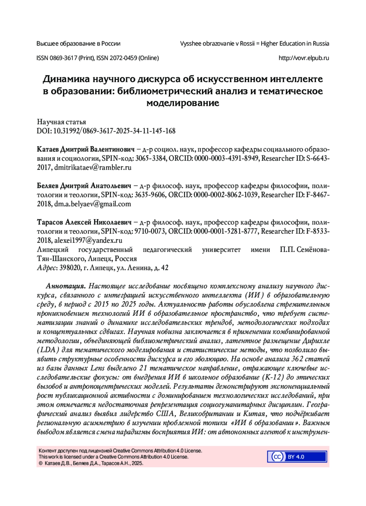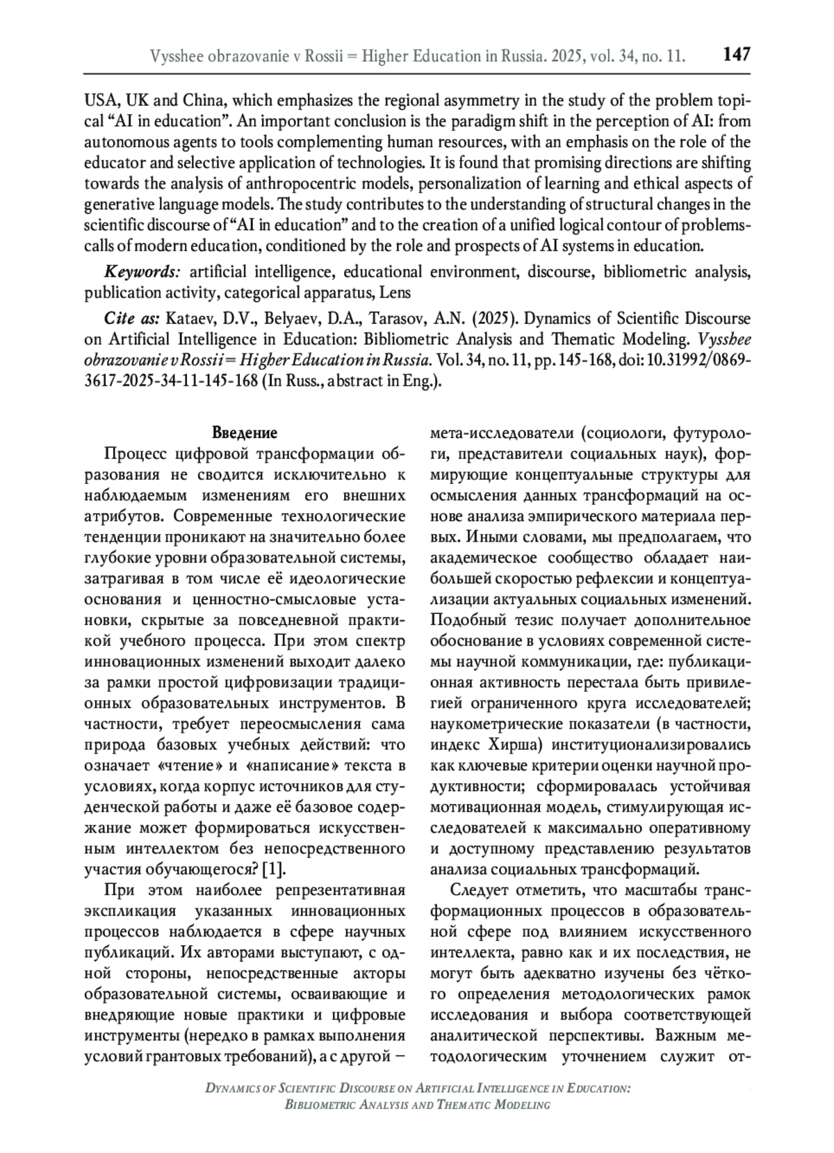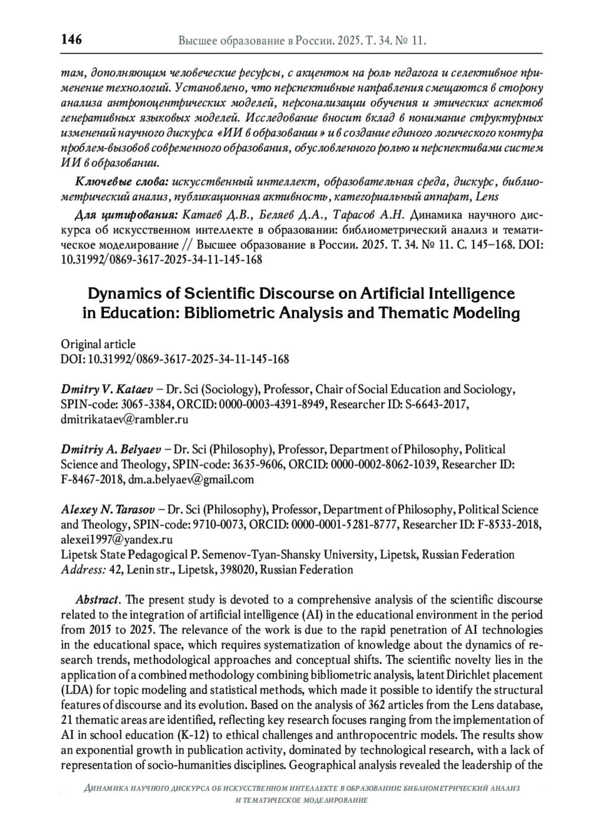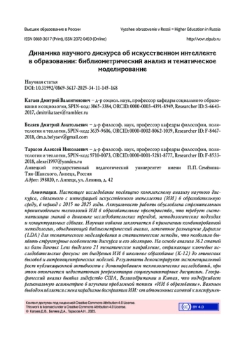 Настоящее исследование посвящено комплексному анализу научного дискурса, связанного с интеграцией искусственного интеллекта (ИИ) в образовательную среду, в период с 2015 по 2025 годы. Актуальность работы обусловлена стремительным проникновением технологий ИИ в образовательное пространство, что требует систематизации знаний о динамике исследовательских трендов, методологических подходах и концептуальных сдвигах. Научная новизна заключается в применении комбинированной методологии, объединяющей библиометрический анализ, латентное размещение Дирихле (LDA) для тематического моделирования и статистические методы, что позволило выявить структурные особенности дискурса и его эволюцию. На основе анализа 362 статей из базы данных Lens выделено 21 тематическое направление, отражающее ключевые исследовательские фокусы: от внедрения ИИ в школьное образование (K-12) до этических вызовов и антропоцентрических моделей. Результаты демонстрируют экспоненциальный рост публикационной активности с доминированием технологических исследований, при этом отмечается недостаточная репрезентация социогуманитарных дисциплин. Географический анализ выявил лидерство США, Великобритании и Китая, что подчёркивает региональную асимметрию в изучении проблемной топики «ИИ в образовании». Важным выводом является смена парадигмы восприятия ИИ: от автономных агентов к инструментам, дополняющим человеческие ресурсы, с акцентом на роль педагога и селективное применение технологий. Установлено, что перспективные направления смещаются в сторону анализа антропоцентрических моделей, персонализации обучения и этических аспектов генеративных языковых моделей. Исследование вносит вклад в понимание структурных изменений научного дискурса «ИИ в образовании» и в создание единого логического контура проблем-вызовов современного образования, обусловленного ролью и перспективами систем ИИ в образовании.