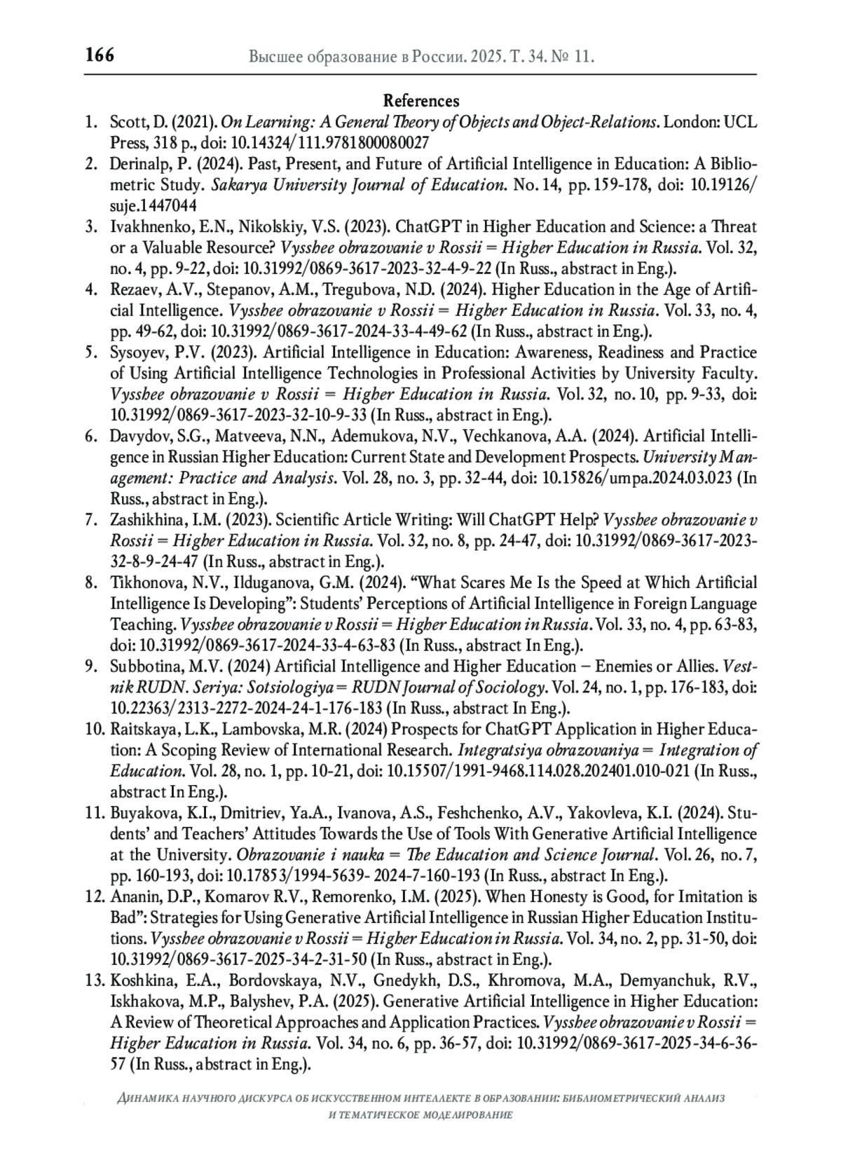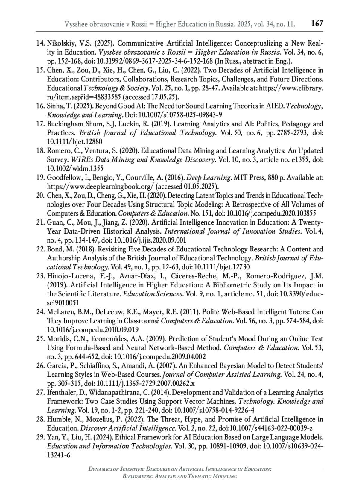 14. Никольский В.С. Коммуникативный искусственный интеллект: концептуализация новой реальности в образовании // Высшее образование в России. 2025. Т. 34. № 6. С. 152-168. DOI: 10.31992/0869-3617-2025-34-6-152-168 EDN: VDEXYD