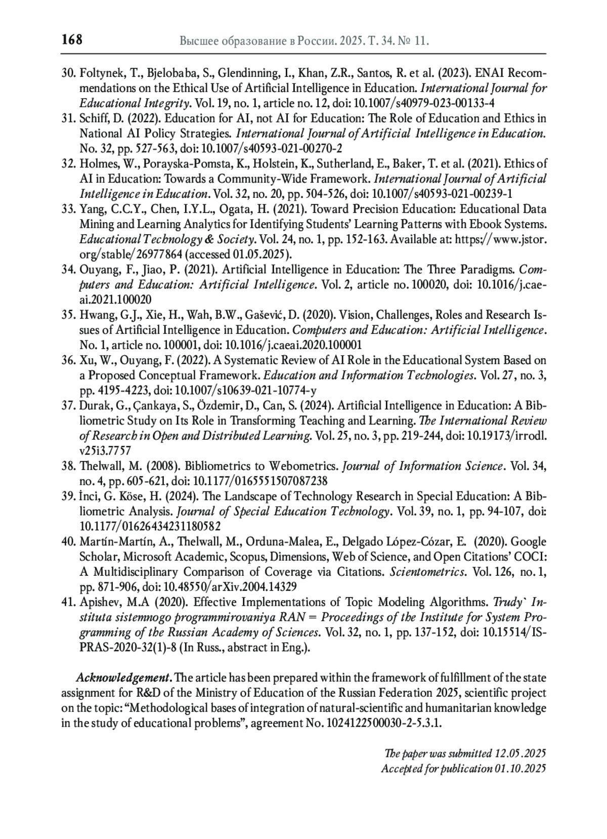 36. Xu W., Ouyang F. A systematic review of AI role in the educational system based on a proposed conceptual framework // Education and Information Technologies. 2022. Vol. 27. No. 3. P. 4195-4223. DOI: 10.1007/s10639-021-10774-y EDN: XYALZP