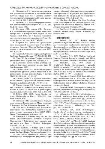 6. Малышенко Г.И. Молодежные организации российского казачества в дальневосточном зарубежье (1920-1937 гг.) // Вестник Томского государственного университета. История и археология. 2005. № 288. С. 170-175.