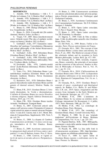 15. Bruno, G., 2007. Centoventi articoli sulla natura e sull’universo contro i Peripatetici (Centum et viginti articuli de natura et mundo adversus Peripateticos) / А cura di E. Canone, trad. it. di C. Monti. Bruniana & Campane-lliana, Supplementi, XIX, Testi, 5, pp. xxii-54.