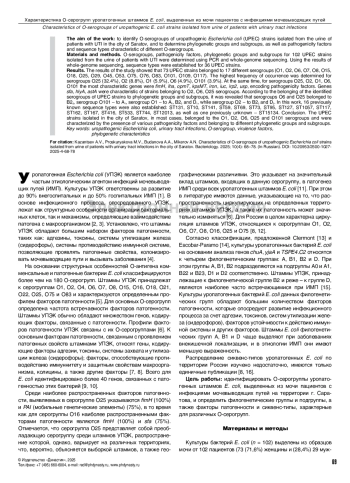 Материалы и методы. О-серогруппы, факторы патогенности, филогенетические группы и подгруппы для 102 штаммов УПЭК, выделенных из мочи пациентов с ИМП, определяли с использованием методов полимеразной цепной реакции и полногеномного секвенирования. С использованием результатов полногеномного секвенирования установлены сиквенс-типы для 36 штаммов УПЭК.