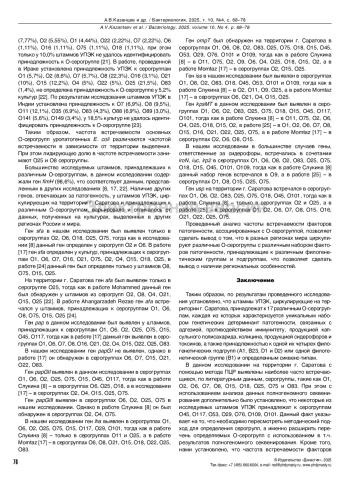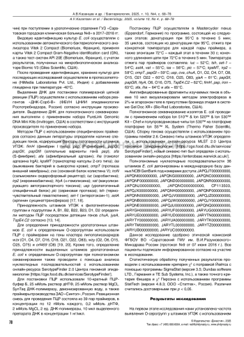 Заключение. Штаммы УПЭК, выделенные на территории г. Саратова, в большинстве случаев принадлежали к серогруппам О1, О2, О6, О25 и О101 и характеризовались наличием различных факторов патогенности и принадлежностью к различным филогенетическим группам и подгруппам.