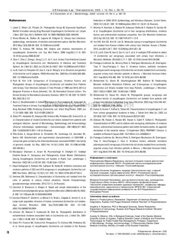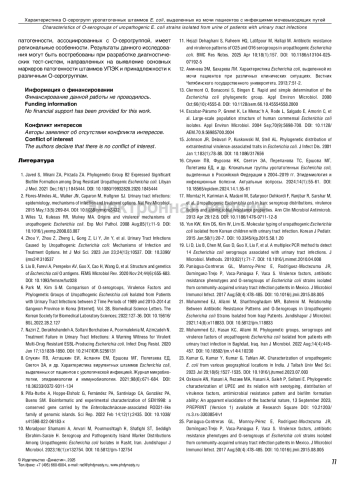 8. Слукин ПВ, Асташкин ЕИ, Асланян ЕМ, Ершова МГ, Полетаева ЕД, Светоч ЭА, и др. Характеристика вирулентных штаммов Escherichia coli, выделенных от пациентов с урологической инфекцией. Журнал микробиологии, эпидемиологии и иммунобиологии. 2021;98(6):671-684. DOI: 10.36233/0372-9311-134