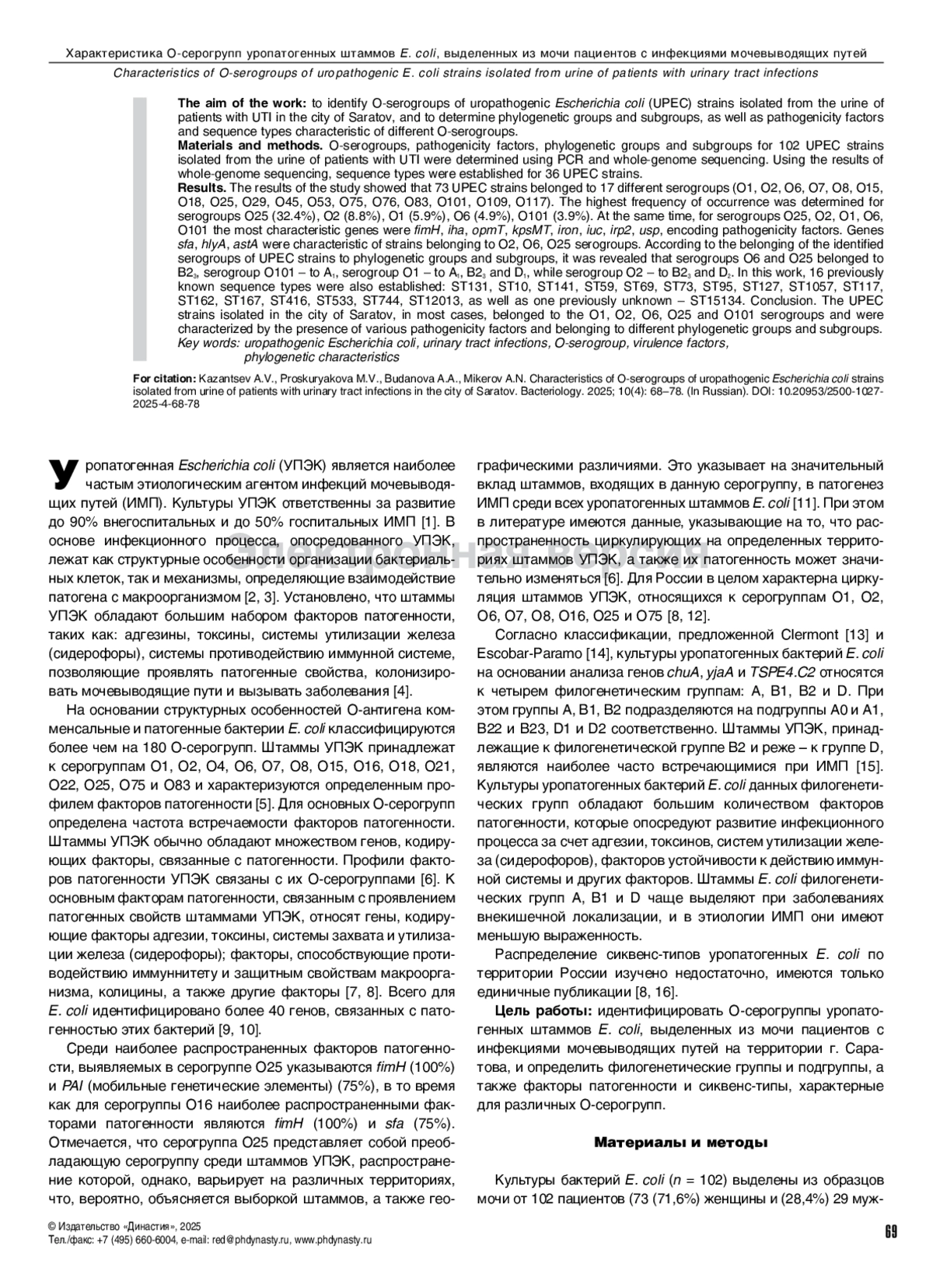 Результаты. Установлено, что 73 штамма УПЭК принадлежали к 17 различным серогруппам (О1, О2, О6, О7, О8, О15, О18, О25, О29, О45, О53, О75, О76, О83, О101, О109, О117). Наибольшая частота встречаемости определена для серогрупп О25 (32,4%), О2 (8,8%), О1 (5,9%), О6 (4,9%), О101 (3,9%). При этом для серогрупп О25, О2, О1, О6, О101 наиболее характерными были гены fimH, iha, opmT, kpsMT, iron, iuc, irp2, usp, кодирующие факторы патогенности. Гены sfa, hlyA, astA были характерны для штаммов, принадлежащих к серогруппам О2, О6, О25. При определении принадлежности идентифицированных серогрупп штаммов УПЭК к филогенетическим группам и подгруппам было выявлено, что серогруппы О6 и О25 принадлежали к B23, серогруппа О101 – к А1, серогруппа О1 – к А1, В23 и D1, тогда как серогруппа О2 – к B23 и D2. В данной работе также установлены 16 ранее известных сиквенс-типов: ST131, ST10, ST141, ST59, ST69, ST73, ST95, ST127, ST1057, ST117, ST162, ST167, ST416, ST533, ST744, ST12013, а также один неизвестный – ST15134.