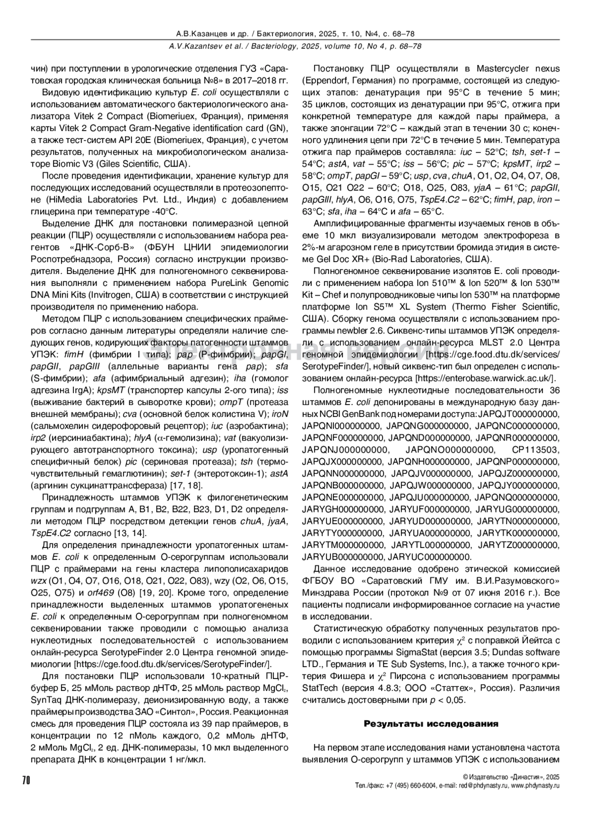 Цель работы. Идентифицировать О-серогруппы уропатогенных штаммов Escherichia coli (УПЭК), выделенных из мочи пациентов с инфекцией мочевыводящих путей (ИМП) на территории г. Саратова, и определить филогенетические группы и подгруппы, а также факторы патогенности и сиквенс-типы, характерные для различных О-серогрупп.