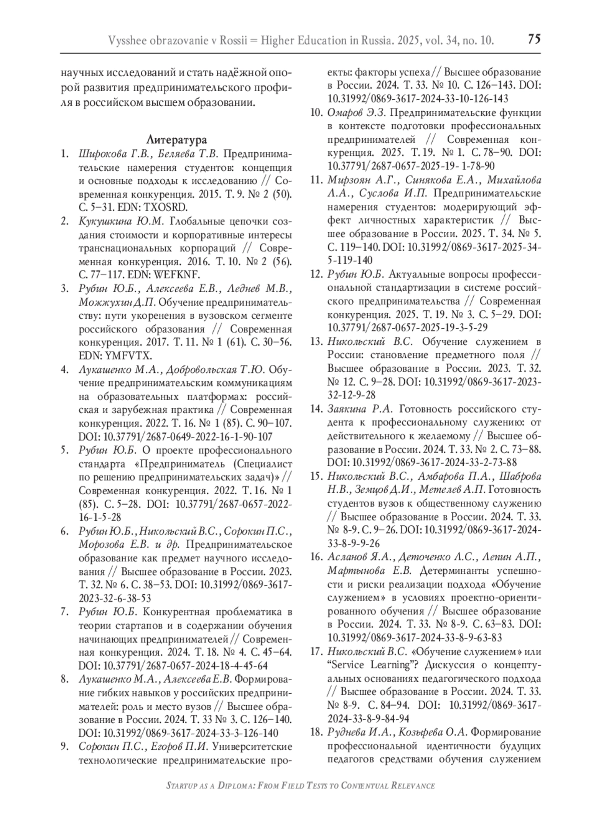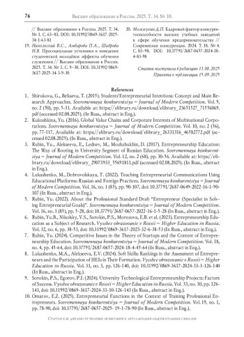 6. Рубин Ю.Б., Никольский В.С., Сорокин П.С., Морозова Е.В. и др. Предпринимательское образование как предмет научного исследования // Высшее образование в России. 2023. Т. 32. № 6. С. 38-53. DOI: 10.31992/0869-3617-2023-32-6-38-53 EDN: DWGJQS