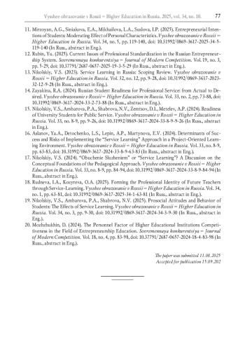11. Мирзоян А.Г., Синякова Е.А., Михайлова Л.А., Суслова И.П. Предпринимательские намерения студентов: модерирующий эффект личностных характеристик // Высшее образование в России. 2025. Т. 34. № 5. С. 119-140. DOI: 10.31992/0869-3617-2025-34-5-119-140 EDN: AUEOQQ