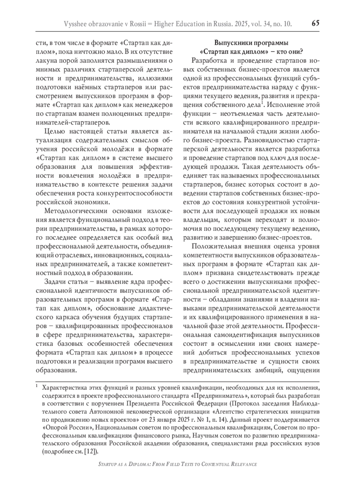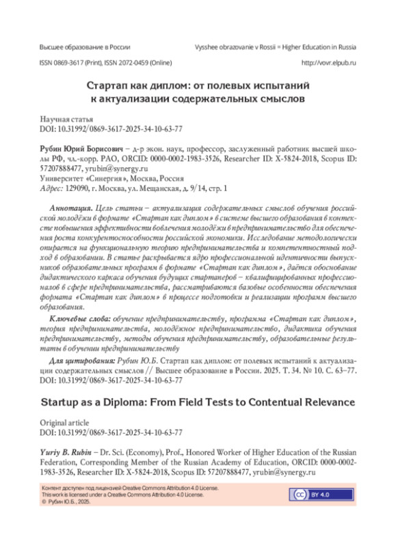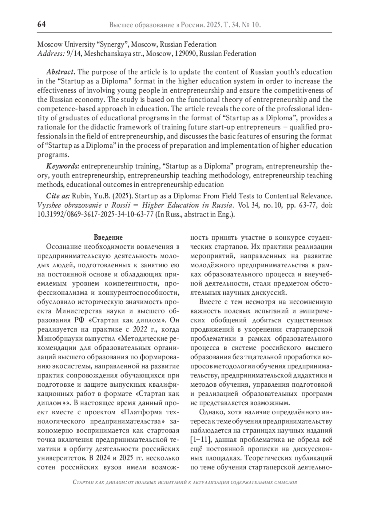 ОБУЧЕНИЕ ПРЕДПРИНИМАТЕЛЬСТВУ, ПРОГРАММА “СТАРТАП КАК ДИПЛОМ”, ТЕОРИЯ ПРЕДПРИНИМАТЕЛЬСТВА, МОЛОДЁЖНОЕ ПРЕДПРИНИМАТЕЛЬСТВО, ДИДАКТИКА ОБУЧЕНИЯ ПРЕДПРИНИМАТЕЛЬСТВУ, МЕТОДЫ ОБУЧЕНИЯ ПРЕДПРИНИМАТЕЛЬСТВУ, ОБРАЗОВАТЕЛЬНЫЕ РЕЗУЛЬТАТЫ В ОБУЧЕНИИ ПРЕДПРИНИМАТЕЛЬСТВУ