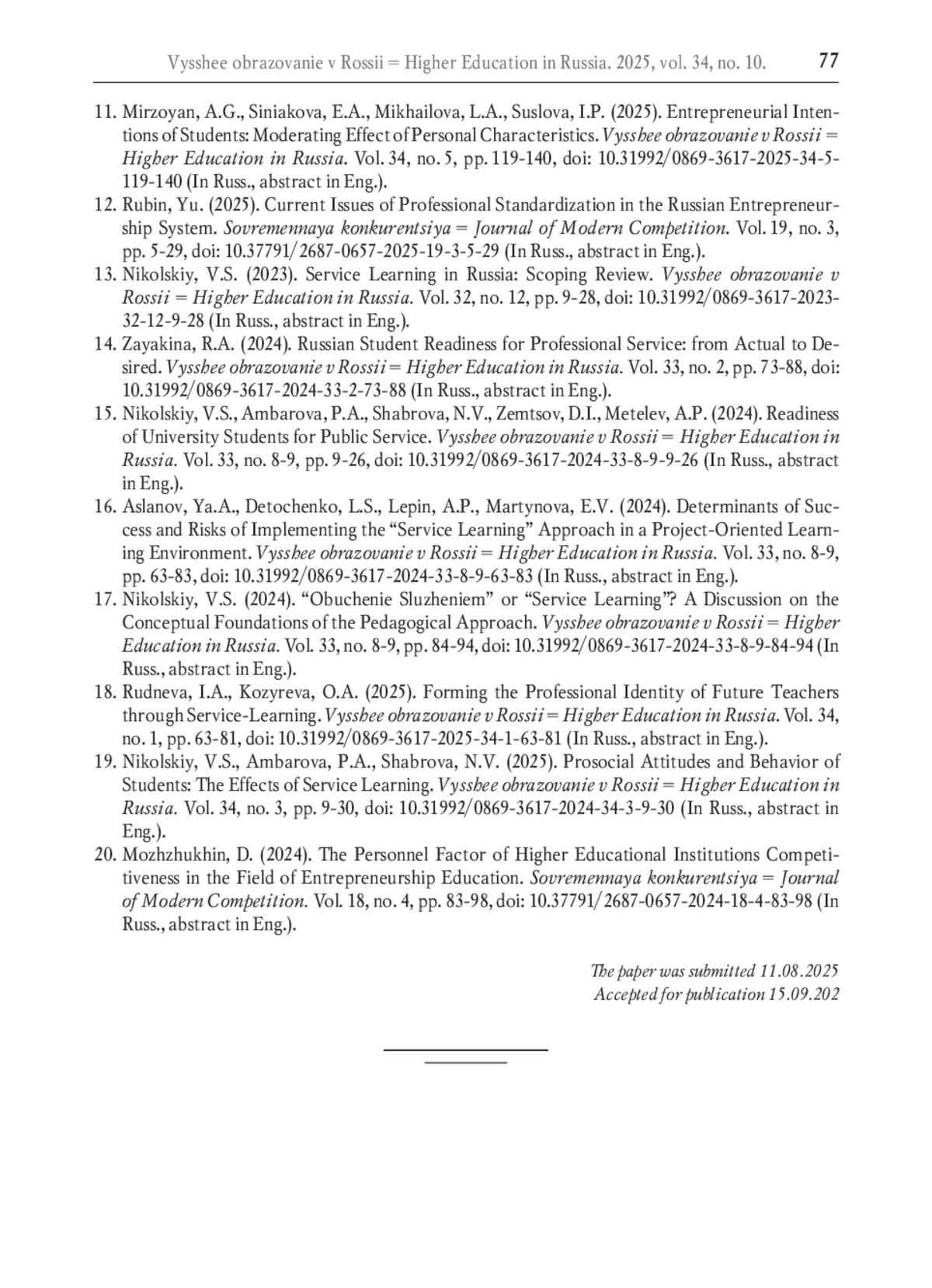 19. Никольский В.С., Амбарова П.А., Шаброва Н.В. Просоциальные установки и поведение студенческой молодёжи: эффекты обучения служением // Высшее образование в России. 2025. Т. 34. № 3. С. 9-30. DOI: 10.31992/0869-3617-2025-34-3-9-30 EDN: QPCYQZ