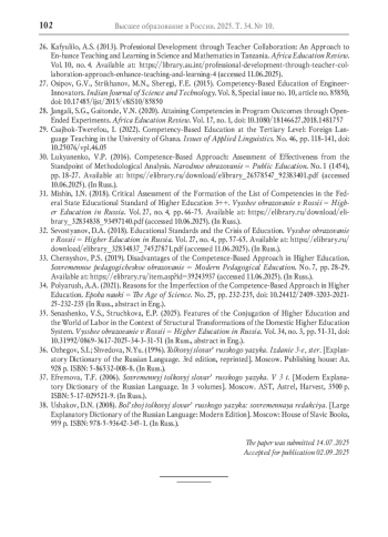 29. Csajbok-Twerefou I.Competency-based education at the tertiary level: foreign language teaching in the University of Ghana // Issues of Applied Linguistics. 2022. No. 46. P. 118-141. DOI: 10.25076/vpl.46.05