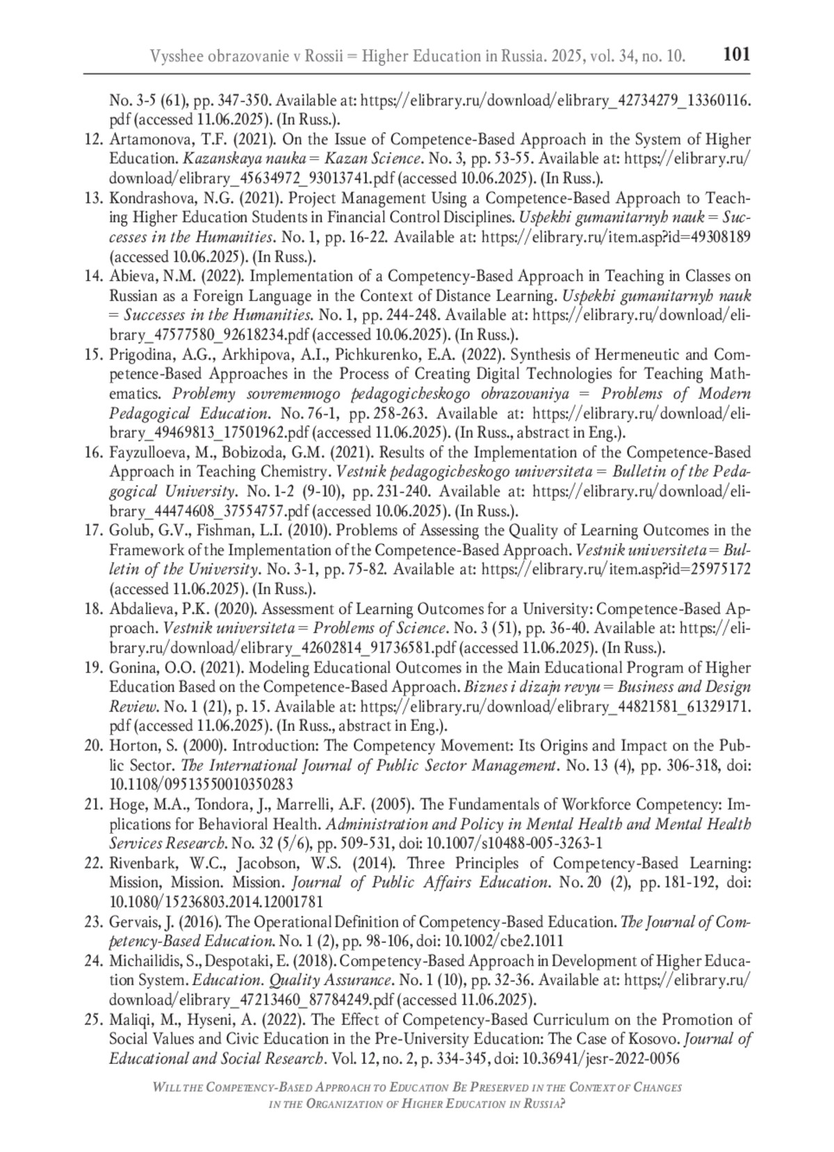 12. Артамонова Т.Ф. К вопросу о компетентностном подходе в системе высшего образования // Казанская наука. 2021. № 3. С. 53-55. EDN: NYSFLE